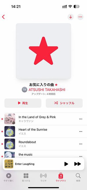 この[お気に入りの曲]プレイリストには、これまでにお気に入りにした曲がまとめられており、もちろんこれからお気に入りにした曲も自動で追加されていきます。お気に入りの曲すべてにこのプレイリストからアクセスでき、連続再生やシャッフル再生をできるわけです。