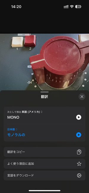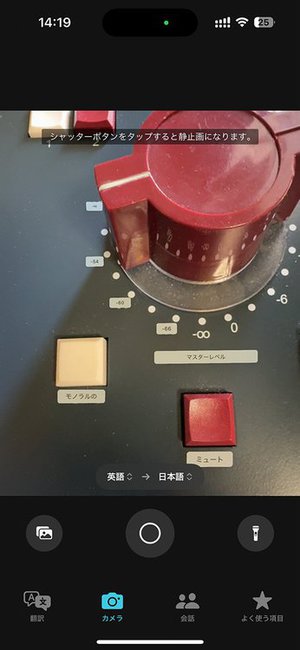 カメラ映像内でお目当ての部分がうまく表示&翻訳されたら、画面中央の[○]ボタンをタップ。するとシャッター音が鳴り、映像と翻訳結果が一時停止的に静止画として固定されます。こうすると翻訳結果を確認しやすいですね。