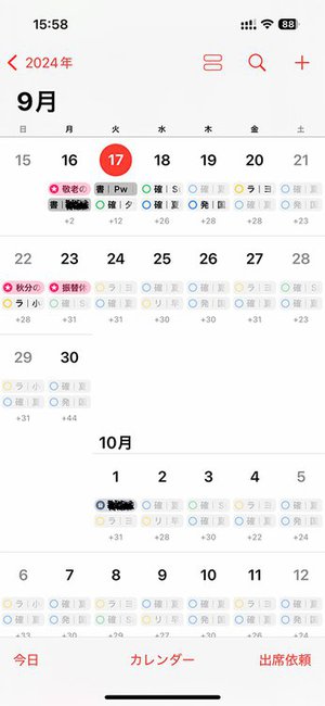純正のカレンダーアプリはiOS 18で全体的に強化され、ググッと使いやすくなりました。その目玉新機能のひとつは「カレンダー内に日時設定ありのリマインダー項目も表示」されるようになったことです。おかげでカレンダーアプリを見るだけで、カレンダーの予定とリマインダーをまとめて確認できるようになりました。特に設定変更は必要なく、iOS 18にアップデートすれば、カレンダー内へのリマインダー表示がデフォルトになっています。便利!