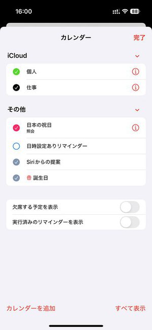 ですがご安心を。デフォルトはそうなっていますが、これまで通り「カレンダーアプリにはリマインダー項目を表示しない」設定も可能です。カレンダーアプリの画面下中央の[カレンダー]をタップして設定画面に移動。そこで[日時設定ありリマインダー]のチェックマークを外して[完了]をタップ。これでリマインダー表示を消すことができます。