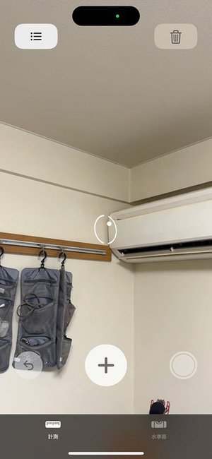 2:画面に円の中に点が書かれたマークが表示されたら、iPhoneを動かしてその点を測定の始点にしたい場所に合わせ、画面の[+]ボタンをタップ。