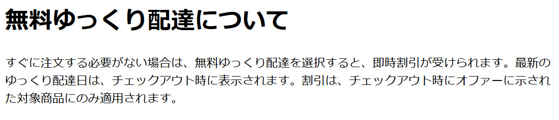 一方で「割引は、チェックアウト時にオファーに示された対象商品にのみ適用されます」ともしており、ゆっくり配達の対象は一部アイテムのみに限られている。