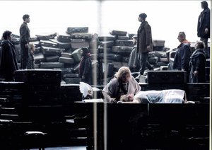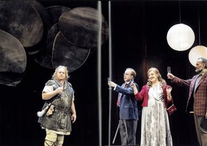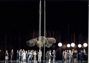 鞄が今度はいい雰囲気の岩石群を形作っていて秀逸な光景である。第一幕は音楽は豊かだが、ヴィジュアル的な場面としては単調で動きが少ない。だが演出家ヘアハイムは、この場面を実に具体的に面白く描いている。