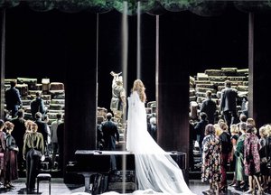あれ、今いた後方にあるホワイエがなんで舞台上にあるわけ?合唱の男女は、ちょうど観客のように美しく着飾ってシャンパンなどを飲んでおり、そのなかにジークリートとブリュンヒルデだけが古い時代の衣装をまとって登場する。この演出は、時間や空間感覚の惑いや、現実と演劇空間の交錯をもたらすが、それがなぜか心地よい。ここは完全に演出家にしてやられたなあ、と脱帽した。