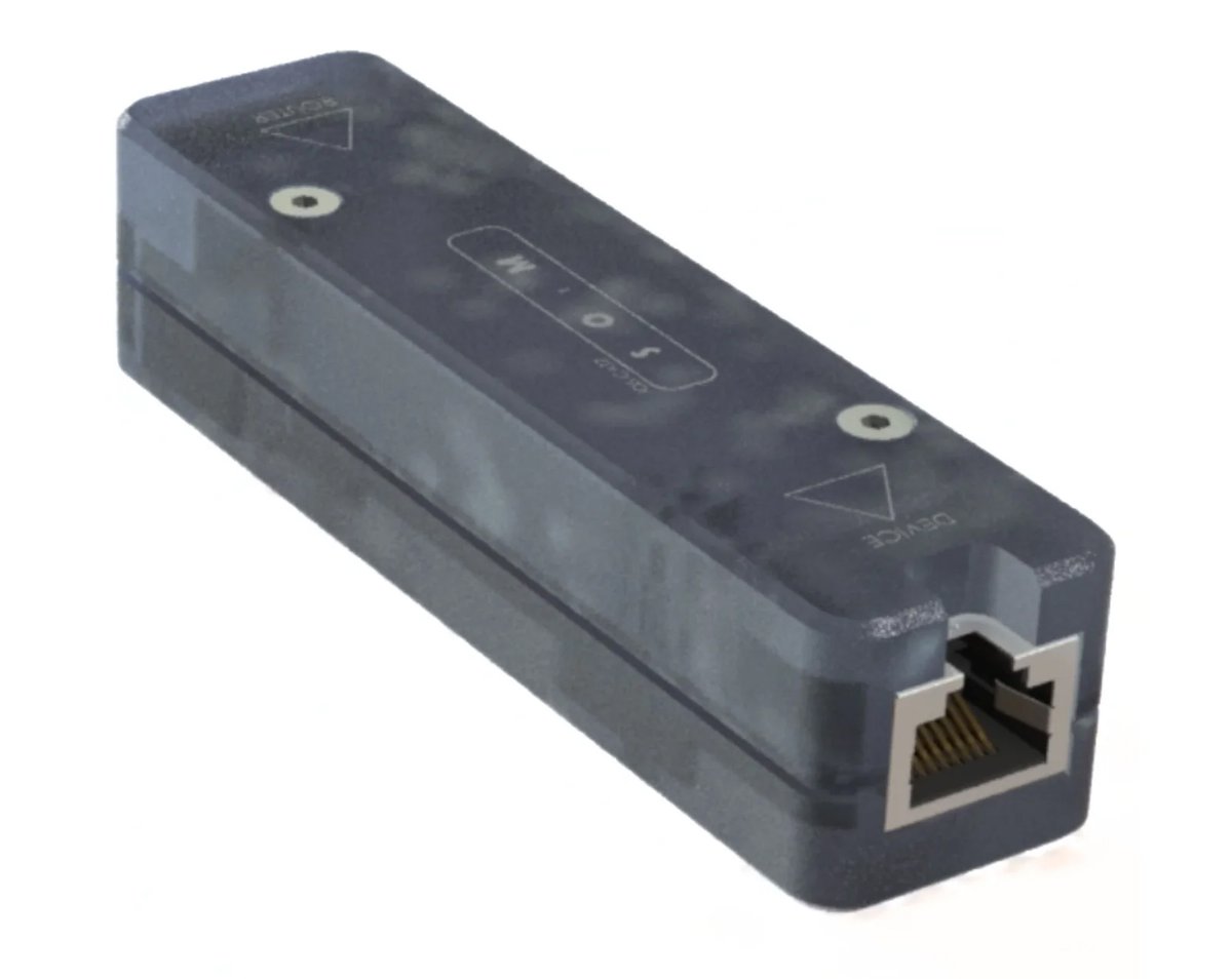 2本のLANケーブルの間に接続して使用するアクセサリー。本製品を用いるためには、もう1本LANケーブルを追加で用意する必要がある。矢印の向きが記載されているので、信号の流れに沿って設置すると良いだろう。