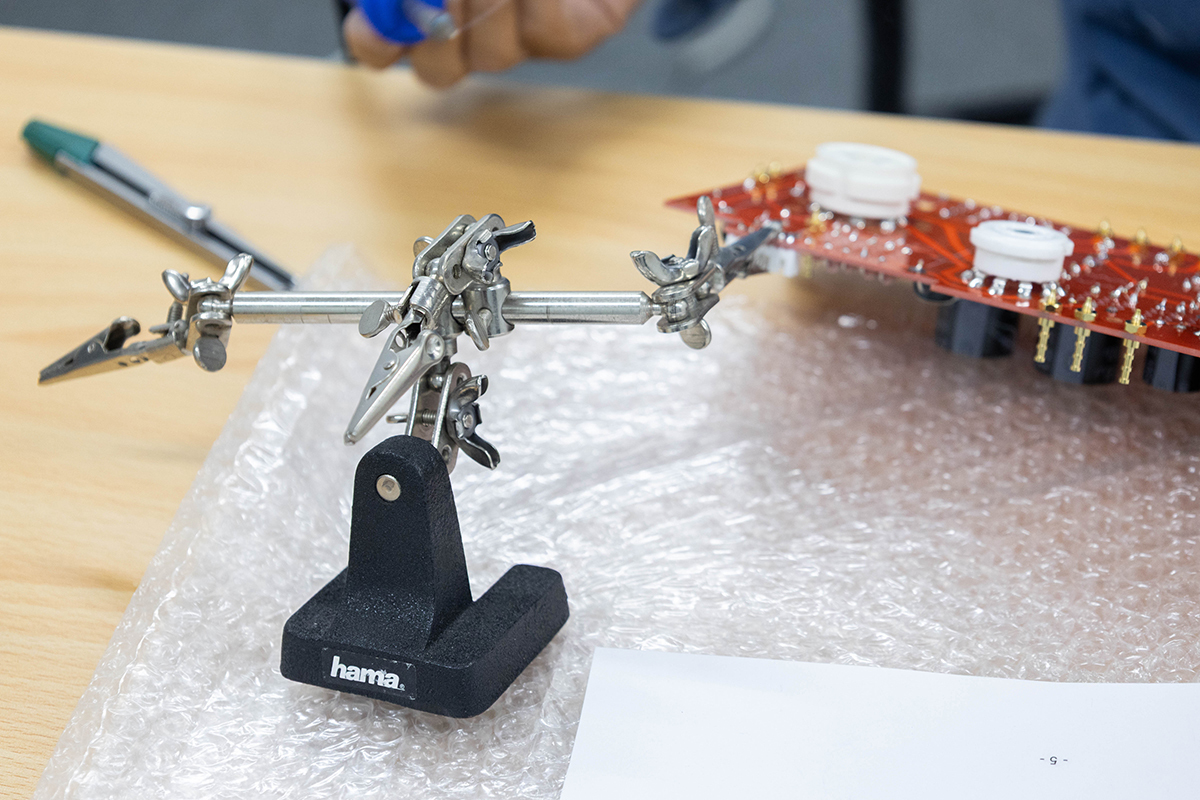 電子部品が個包装されたパッケージを下から順番に切っては基板に差し込んで仮止め、と作業を進めていった。基板がカラフルに、フクザツになっていき、一歩一歩進んでいることを実感できるのが嬉しい。