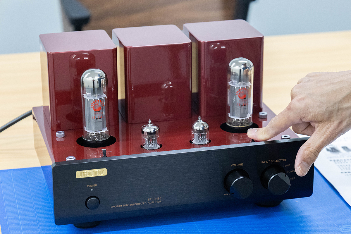 TRK-3488はその型番が示すように、EL34とKT88の2種類の出力管を差し替えて音調の違いを愉しめる特長をもつが、それに加えて、NFB=ネガティブフィードバックのON/OFFスイッチも積んでいる。