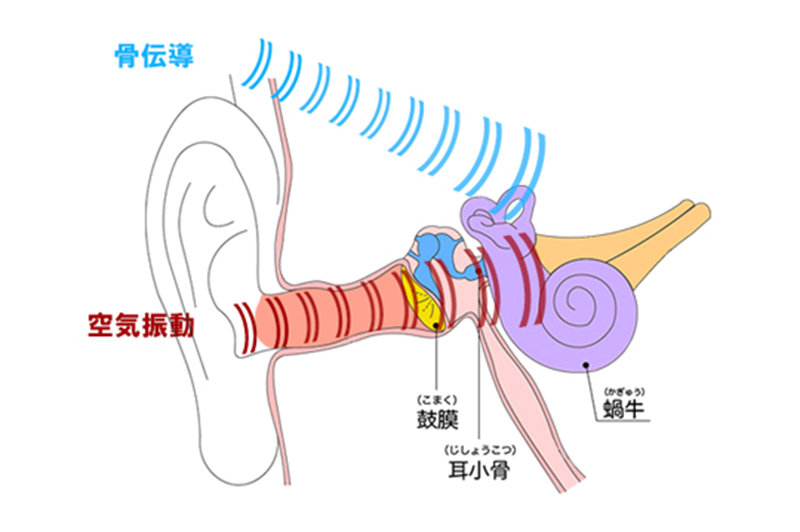 耳の入口付近にある耳珠と呼ばれる軟骨に振動を伝えると、耳珠から耳の穴の内壁の軟骨に振動が伝わり、内壁の振動で耳の穴の中の空気が揺らされて音が鳴り、それが鼓膜に伝わるという仕組み。
