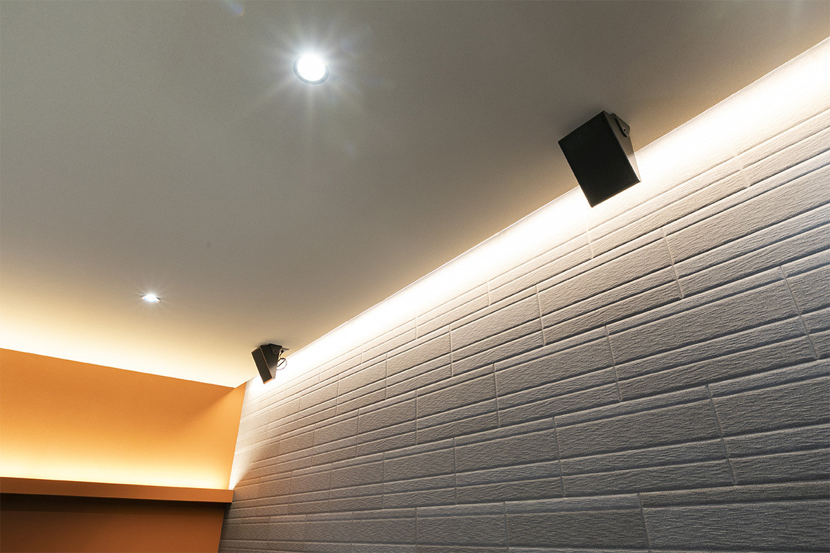 トップのスピーカーはすべて埋め込みタイプを採用。居住空間の美観の保持と、立体音響の臨場感を両立させた。音響の迫力はいわずもがなで、オーナーも大満足。お気に入りのアクション映画を繰り返しご覧になっているという。