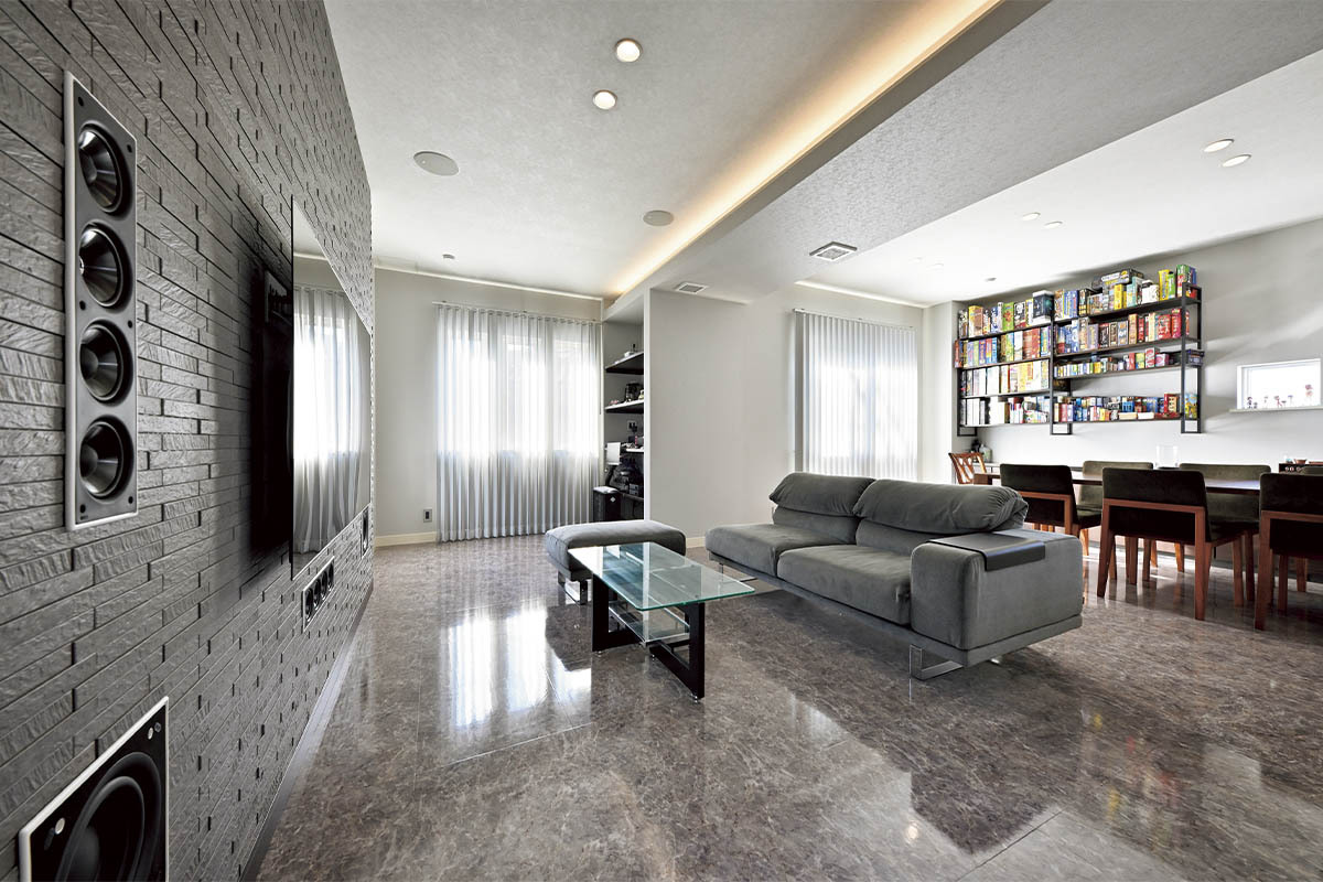 床に機材がないスッキリ空間でホームシアターの機能は本格派。新築時にホームシアターをつくるなら参考にしたいアイデアだ。