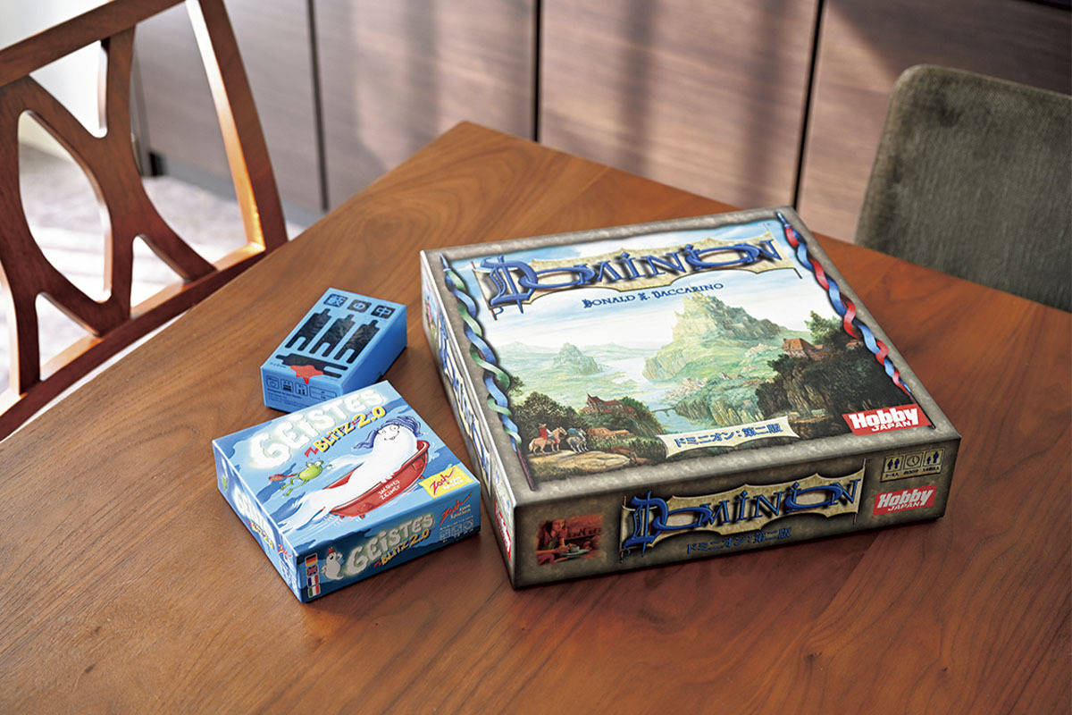 ダイニングの壁には数々のボードゲームがある。ご主人は子供のころから集めているそうで歴はなんと30年! 床に機器を置かないからスッキリ使いやすい