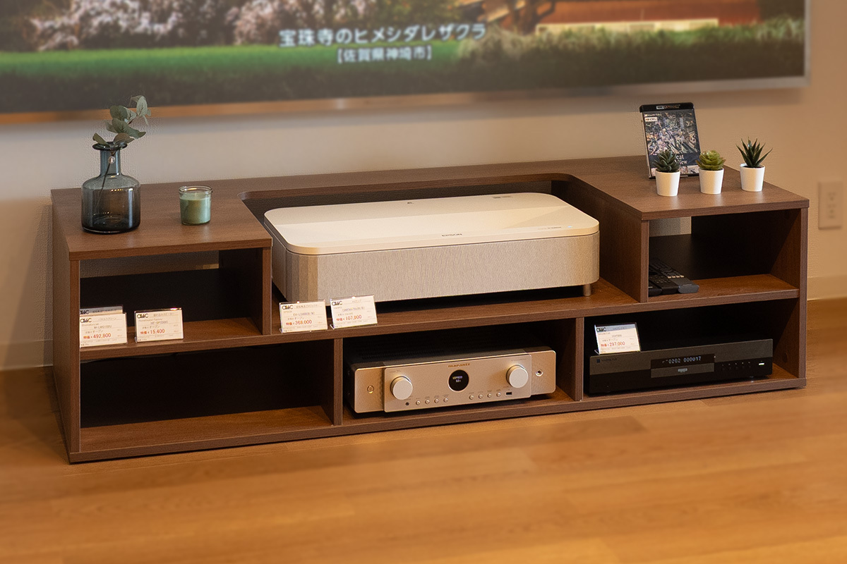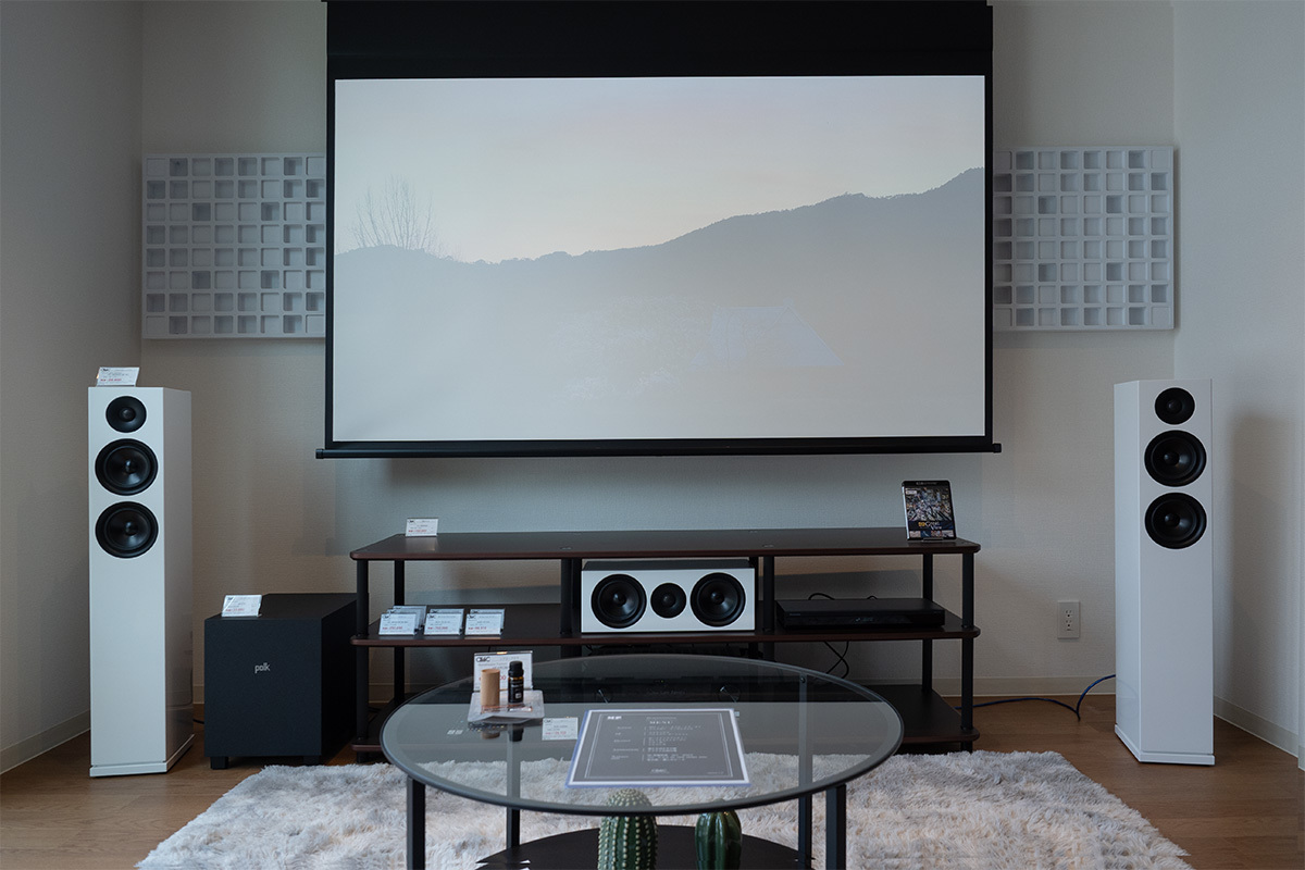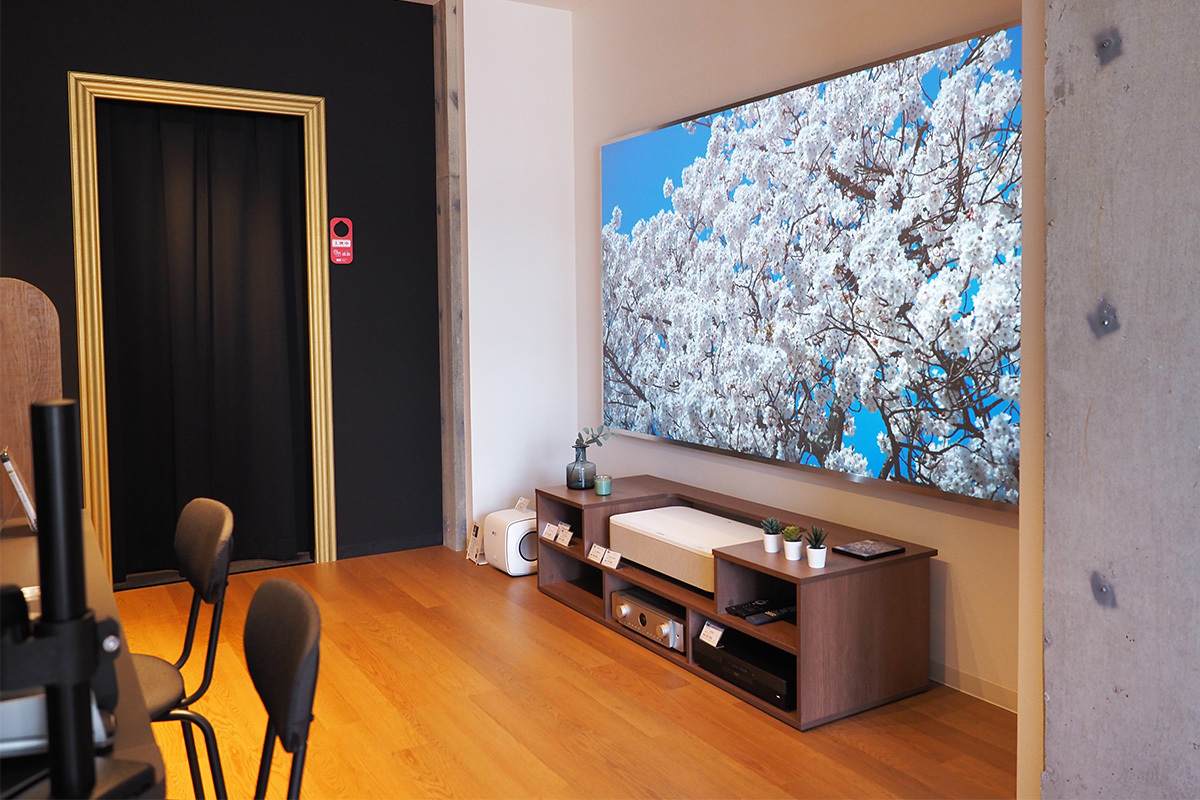 そのまま店内を進むと現れるのは、省スペースで大画面を実現するスタイリッシュシアター。壁面近くに設置できるエプソンの超短焦点プロジェクター「EH-LS800/W」に、Bloomsbury.lab(ブルームズベリー ラボ)の音が出るスクリーン「M-LWO102U」を組み合わせて、MARANTZのスリムAVアンプ「CINEMA 70s」で駆動。なんとこの3アイテムだけで102型&3chサウンドシステムを実現している。