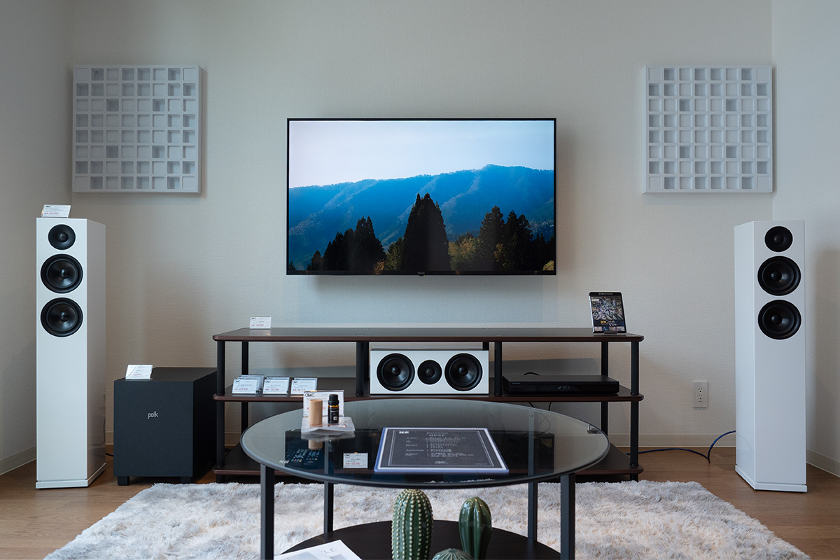 調音パネルなど、シアターのクオリティーアップに寄与するが単体では効果を体感しづらいオプションアイテムも組み合わせてセッティング。ありなしで音がどう変わるかはもちろん、インテリアとのマッチングなども実際に体験できる。