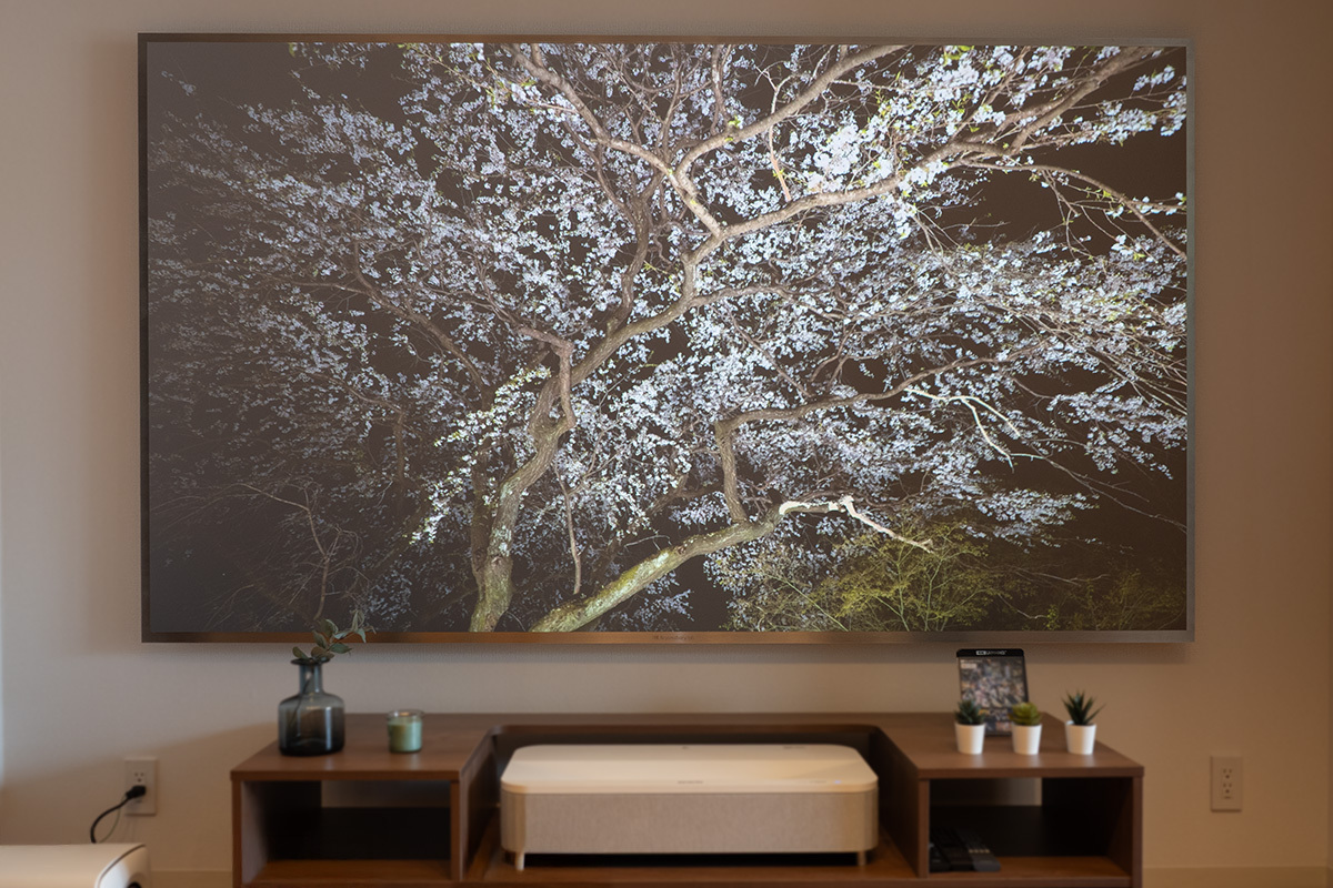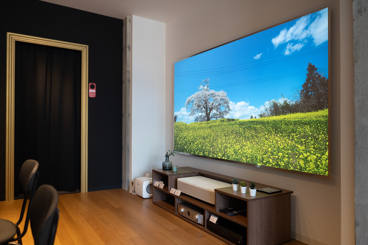 「新しいタイプの製品が多いですが、こうしてセッティングした状態でご体感いただくと、なるほどと腑に落ちたような反応をいただきます。『気軽にはじめたい』という方にとっては選んでいただきやすいのではないでしょうか。明るい部屋でも視聴でき、たとえば音なしで画面に自然映像を流しておくだけでも、リビングの雰囲気が結構違ってきますよ」と谷口店長。