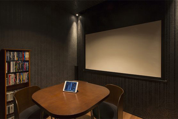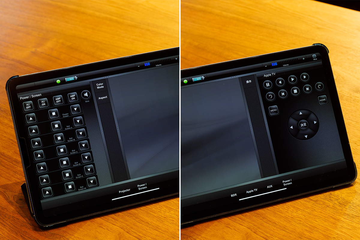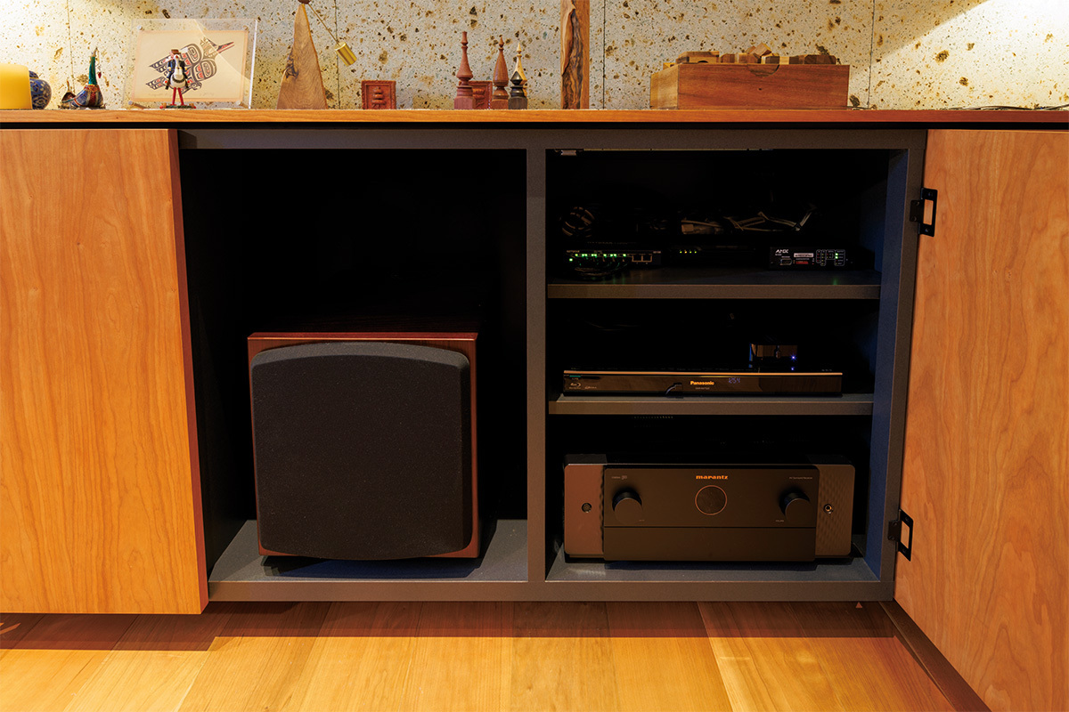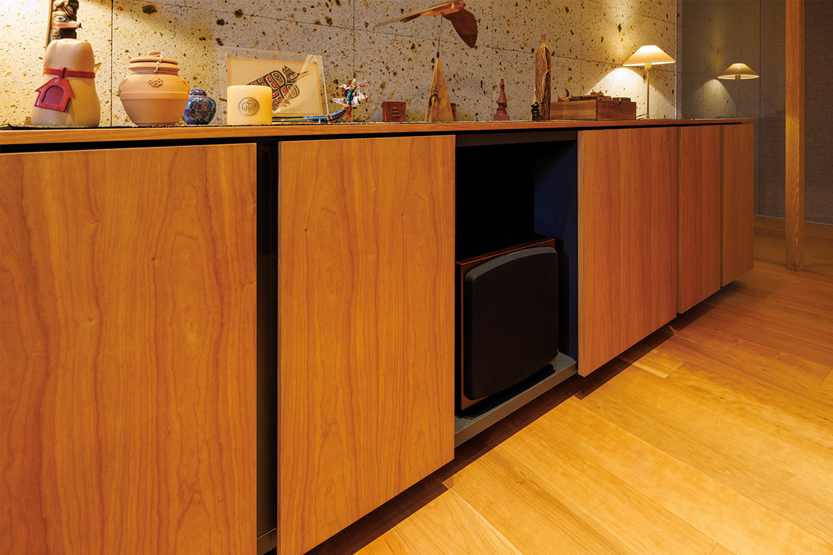 さらに仕上がりの美しさに大きく貢献したのは、オートメーションシステムの配備。機器本体は後方の造作家具にまとめて収納しており、扉を閉めれば使用しない際は存在を感じさせない。それだけでなく、操作はAMXシステムを駆使して一元化し、iPadでコントロールできるよう設定。扉を閉めたままでも操作性に支障はなく、映画を観る際も機器の存在は感じないまま楽しめるのだ。ケーブルやコンセントも隠蔽を徹底した美しい仕上がり。