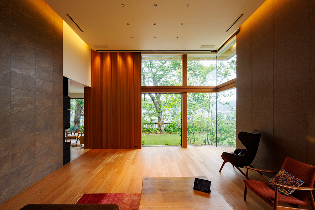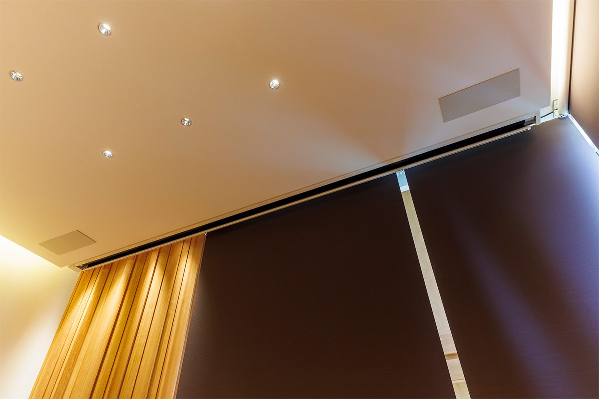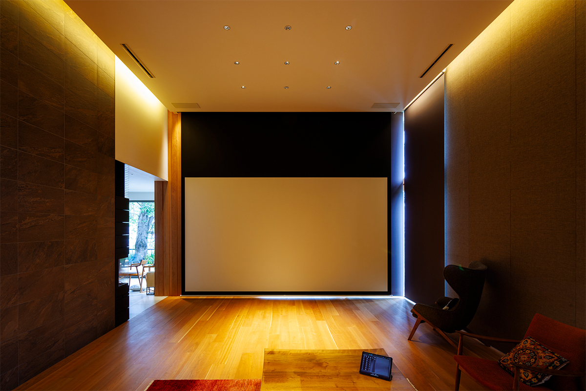 「K邸は室内の開放感と庭の風景の美しさが大きな魅力であり、設計もそれを魅せるつくり。ホームシアターは使わない時間の方が長いので、不使用時は存在を感じさせないよう徹底的に考慮しました」と松崎氏。