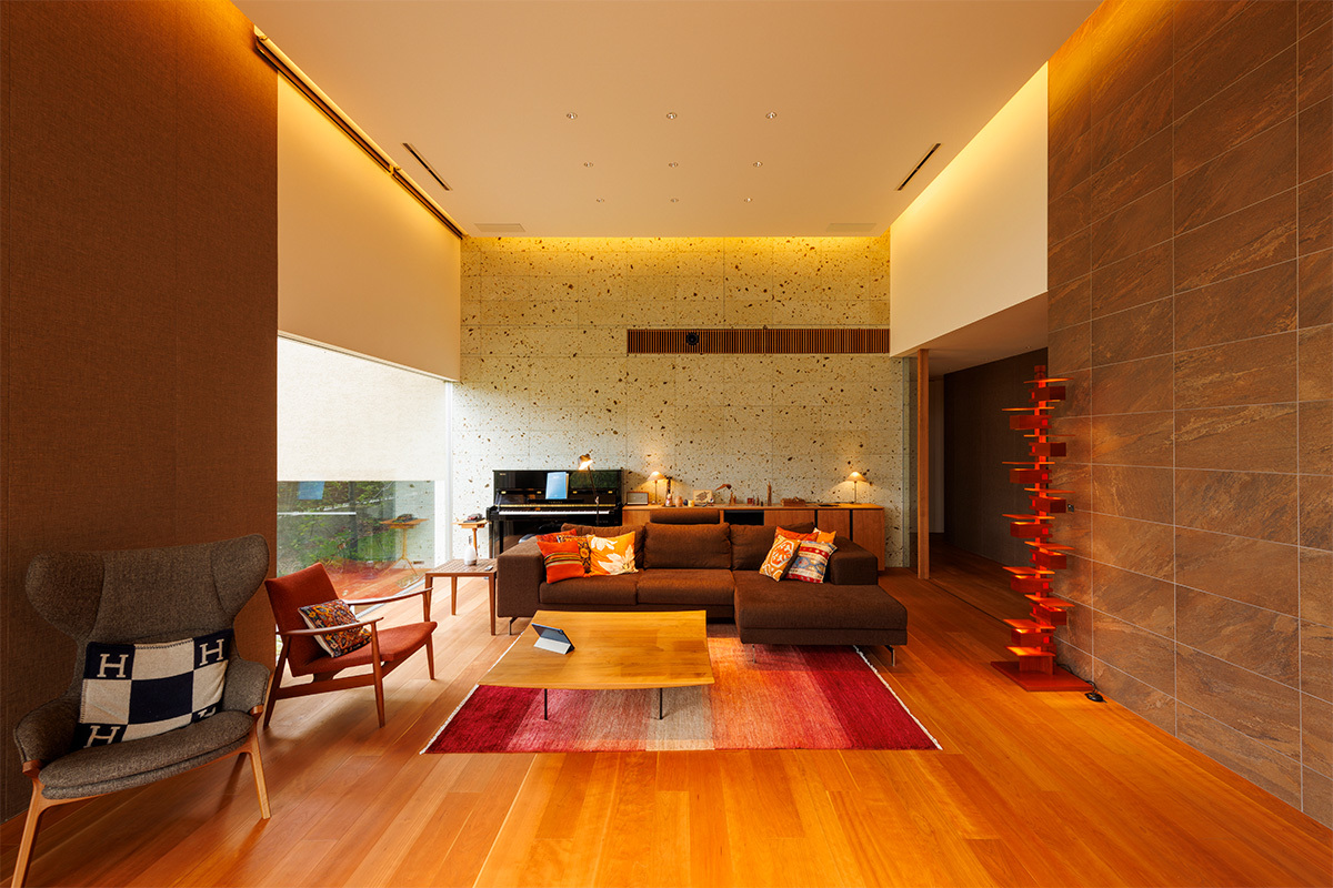 手触りのよさを感じさせるナチュラルテイストで、自然を身近に感じられる癒しのリビング。朝陽が昇ると光がそそぎ、傾くにつれてゆっくりとようすを変えていく。この美しい空間に、実はホームシアターの機能が備わっている。