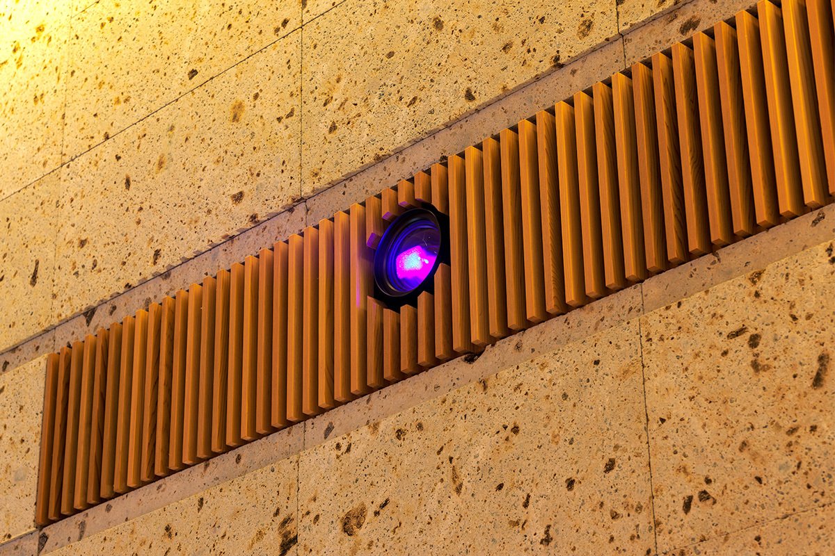 プロジェクターはリビングに隣接する玄関の天井裏に設置。明室かつ200型を投写するため、エプソンの4K対応モデルから業務用の高輝度タイプをチョイスした。レンズ部分のみをくり抜いたルーバーで本体を隠し、機器の存在感をなるべく感じさせないように工夫して設置している。