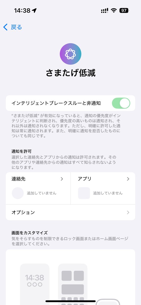 これまでもカスタムモードを作成してその設定を煮詰めるなどすれば、さまたげ低減に似た効果を得ることはできました。またこれも新たに追加された集中モードの新設定「インテリジェントブレークスルーと非通知」をオンにすれば、おやすみモードやカスタムモードを、さまたげ低減とほぼ同じ動作にすることもできます。