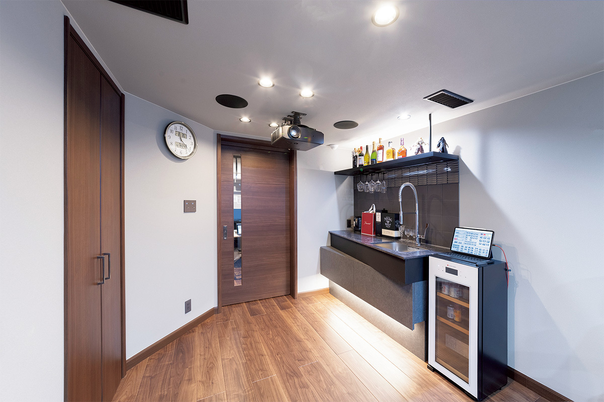 テレワークの普及により、改めて見直されているのが、個の時間を過ごす場所の大切さ。ここでご紹介するMさんもまた、在宅ワークを行うために書斎をつくったというが、そのなかにはホームシアターやバーカウンターなど、長い在宅時間を快適に過ごせるような工夫が満載だ。