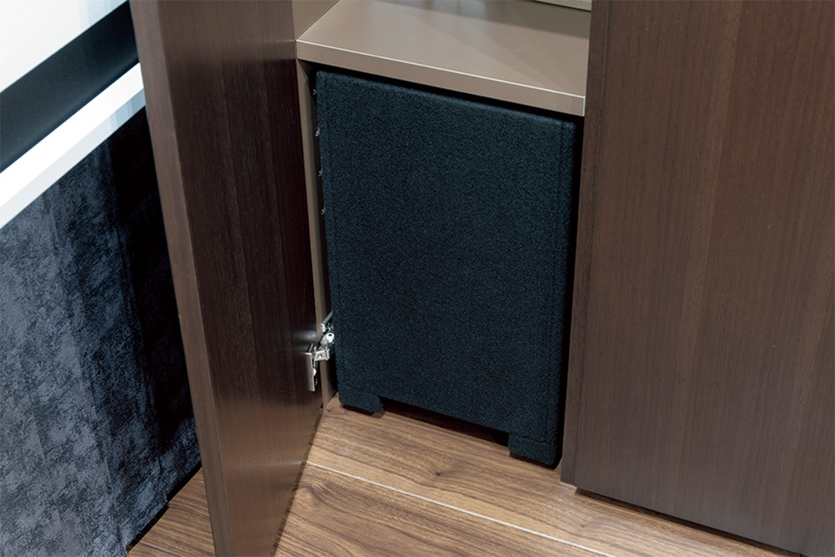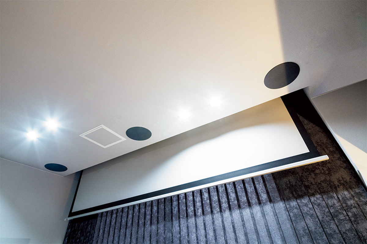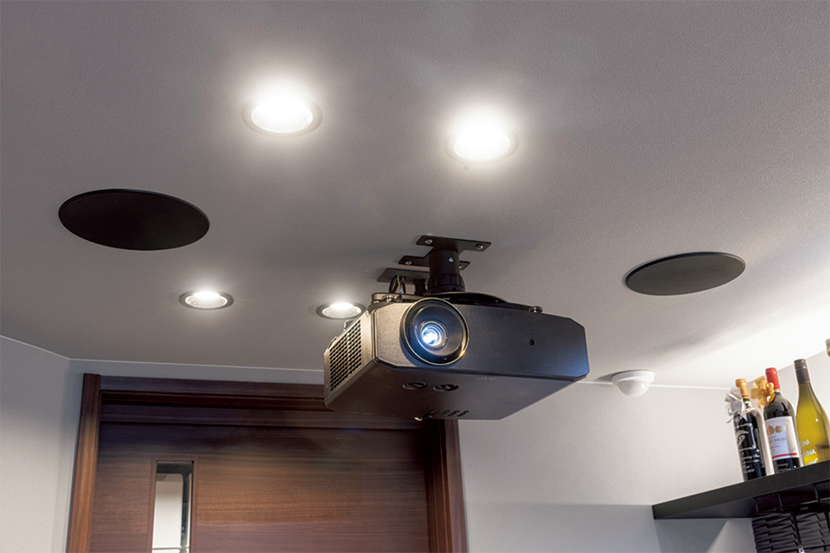 そのテーマどおり、機器の収納はまさに完璧。スクリーンはなるべく大画面がほしいというMさんの要望に応え、120型を実現。5.1.2chのスピーカーは埋め込みタイプ。サブウーファーはキャビネットに、AVアンプなどの機器類は別室に収めているため、動線を妨げることが一切ない。もちろん配線はすべて隠している。