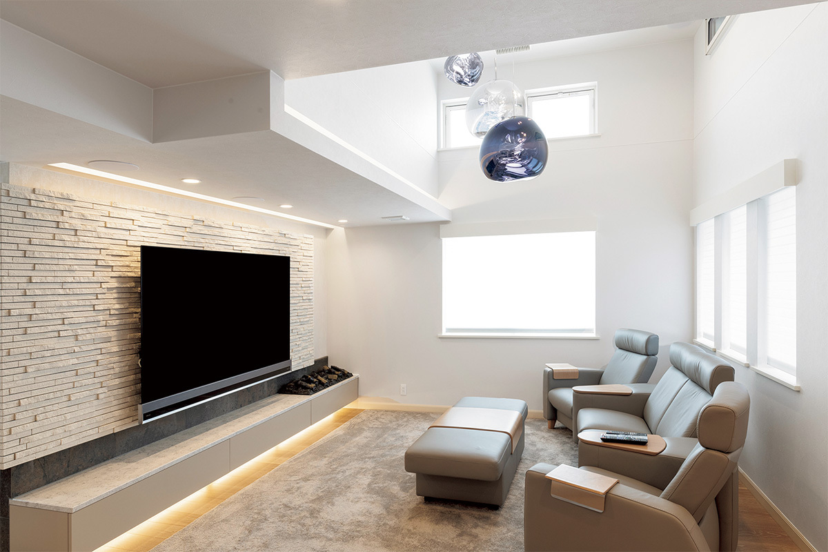 HOME THEATER DATA ●住宅形態:戸建/新築 ●家族構成:夫婦+子ども ●ホームシアターの広さ:約10畳 ●画面サイズ:120型+55型 ●サラウンド:5.1.2ch ●インストール内容:機器設置、システムプランニング、照明プランニング、かんたん操作 ほか