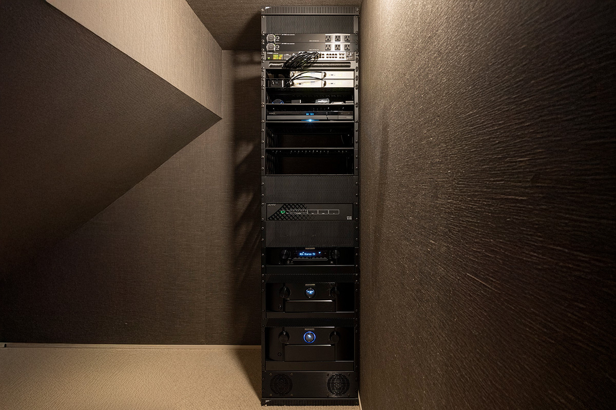 またAMXオートメーションを導入することで、収納家具の扉を閉めて建築やインテリアの意匠に調和させたり、機材室を別に設けてホームシアターを使わない際は機器を完全に隠蔽したりと、部屋の美観を保つ工夫としても有効だ。