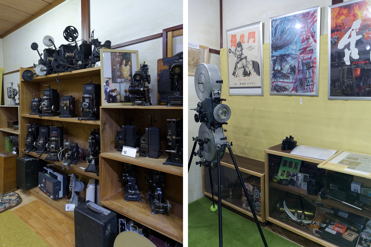 2階にも戸棚にたくさんの機材を陳列。奥に茶室もある広間は、映画の上映会やイベントスペースとして活用されている。オーナーが寄贈を受けるなどして蒐集してきたサイレント時代の映画やアニメーションを16mmの映写機等で映写したり、フィルムをスキャンしてデジタル化したり。