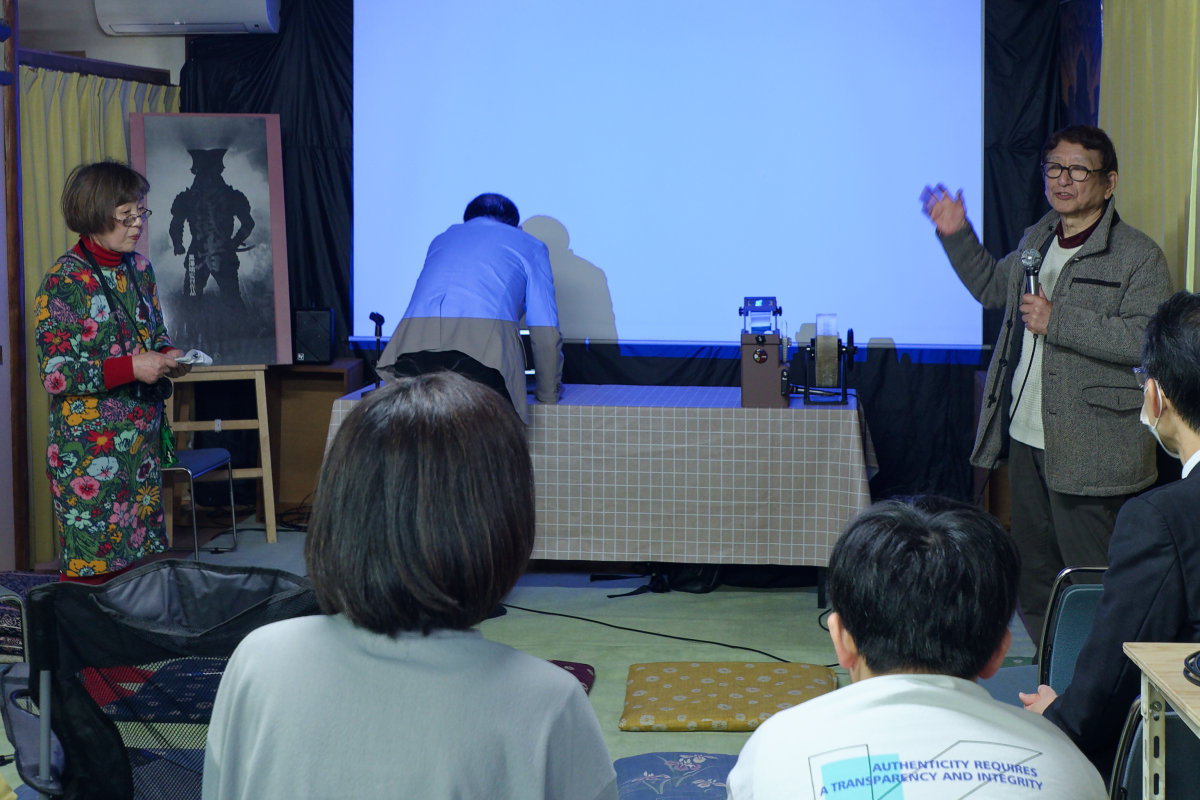 内覧会の目玉の一つとして、橋本典久氏が3Dプリンターで制作した「ミュートスコープ」を本人の解説付きで視聴する機会が設けられた。これは、850枚ほどの写真が円筒に括り付けられたリールを手回しすることで、パラパラ漫画のように順次めくられて動画に見える初期の映像装置である。来場者は橋本さんから説明を受けながら手回しし、熱心に映像を見て感嘆の声を上げていた。