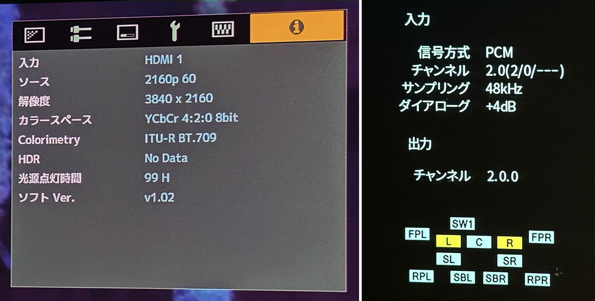 今日はFire TV CubeのHDMI出力をAVアンプにつないで、Prime Videoを110インチスクリーンに投写します。音は配信のフォーマットに準じて2ch(リニアPCM/48kHz)で再生しています。ただし配信の音量レベルが低めのようで、ボリュームはパッケージソフトに比べると大きめになっています。