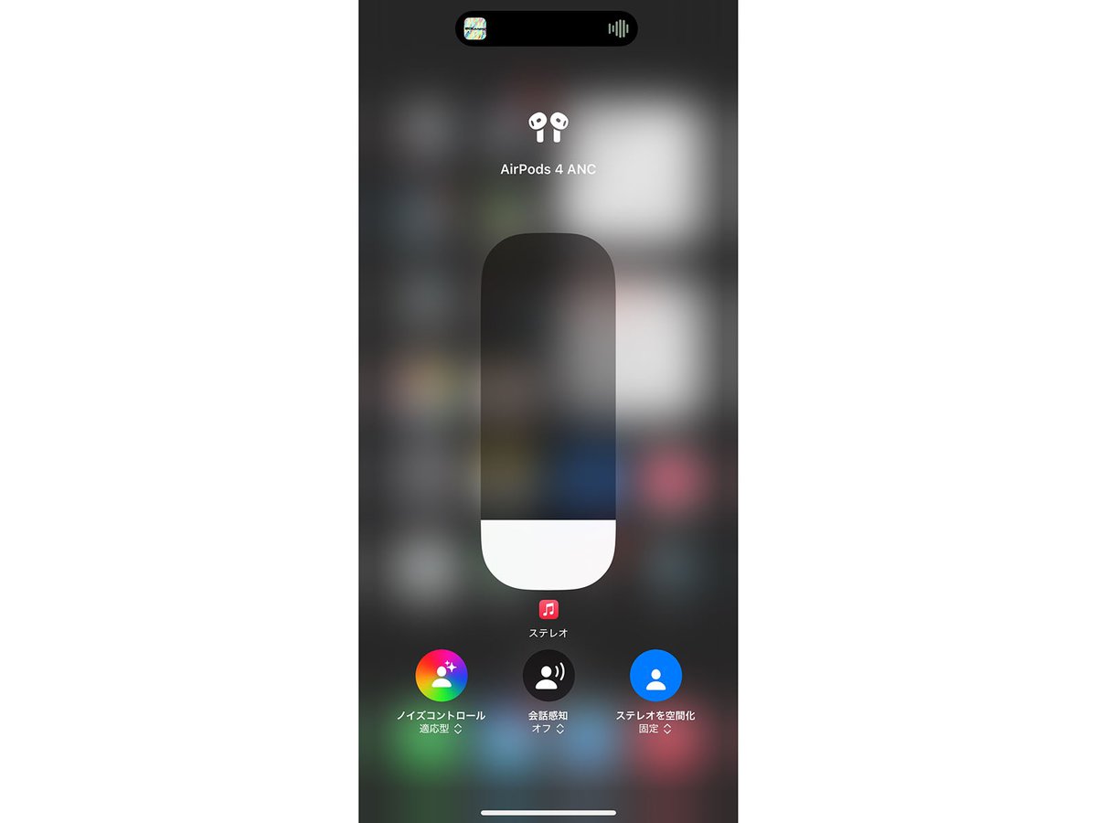 あるいは再生中にiPhoneのコントロールセンターで音量バーをタップ。するとAirPodsの各種機能を操作できる画面が表示されます。より確実にモード選択したいならその画面から操作するのがよいでしょう。