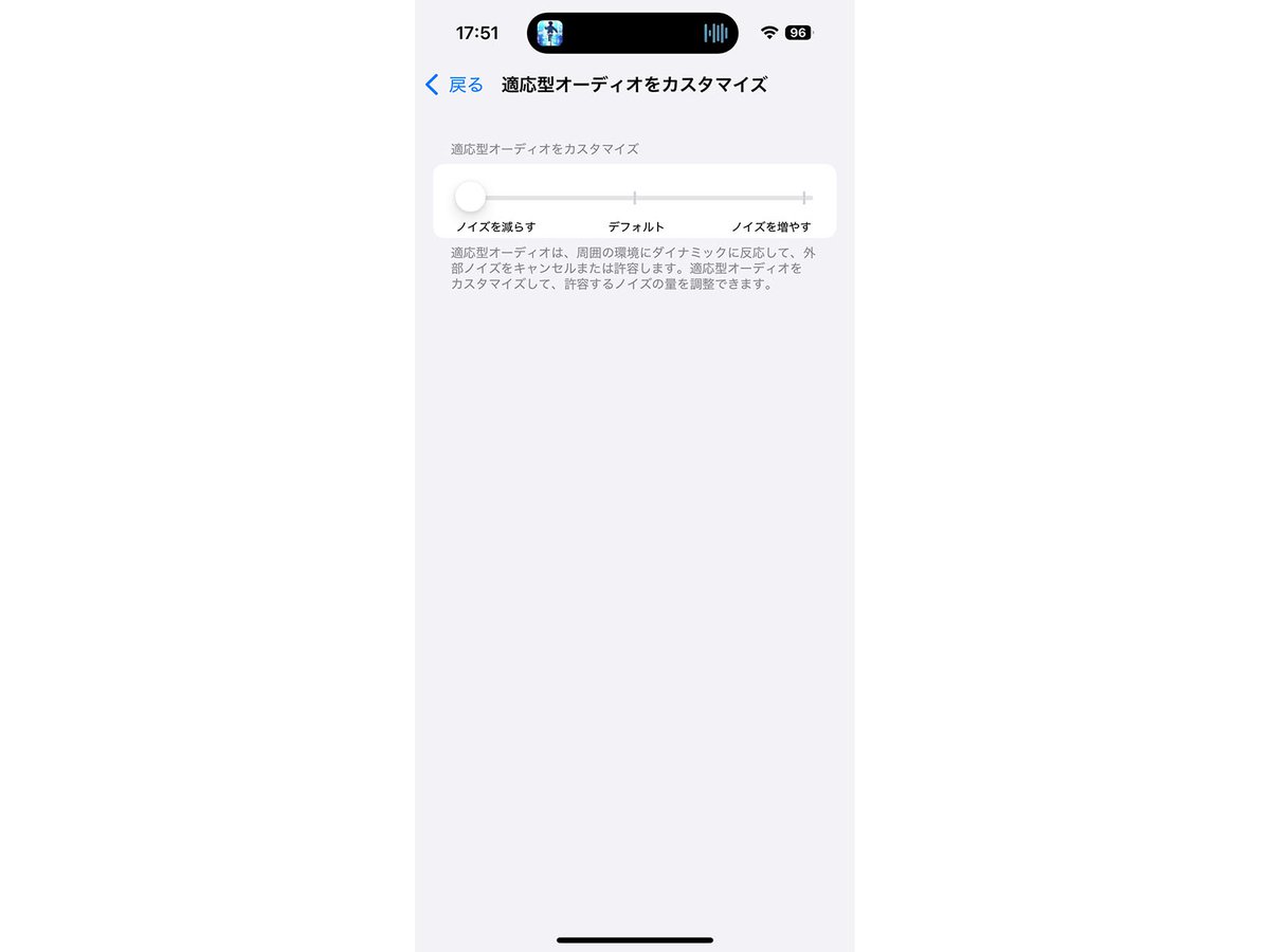 [設定]アプリからAirPodsの設定画面に進んで[適応型オーディオ]をタップ。すると[適応型オーディオをカスタマイズ]の画面が開き、そこには[ノイズを減らす][デフォルト][ノイズを増やす]という3つの設定が用意されています。