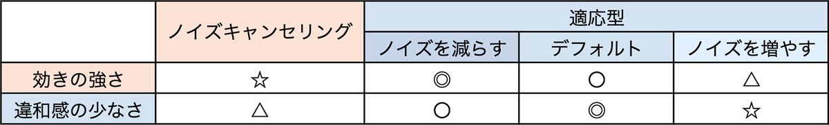もちろん逆に「あの違和感がとにかく苦手!ノイキャンは軽く効いてくれればいいから違和感をできるだけ小さく!」という方は[ノイズを増やす]を選べばよいわけです。