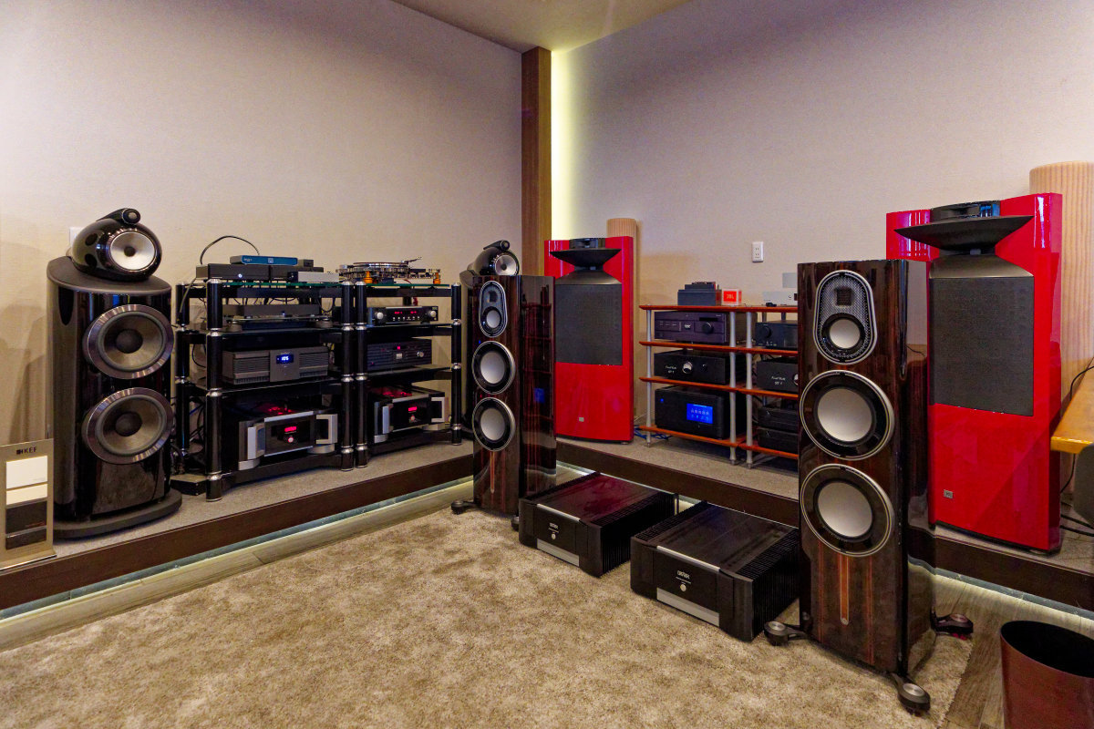 1階ガレージ奥にあるハイエンドオーディオのショールームは旬のブランド製品で占められ、いずれもフラグシップモデルばかり。訪れたときも5セットがシステムとしてセットアップされていた。