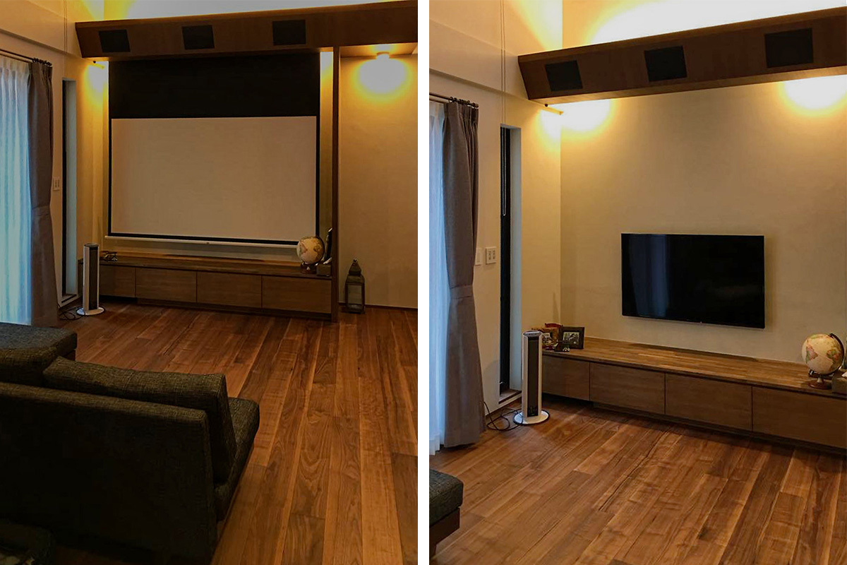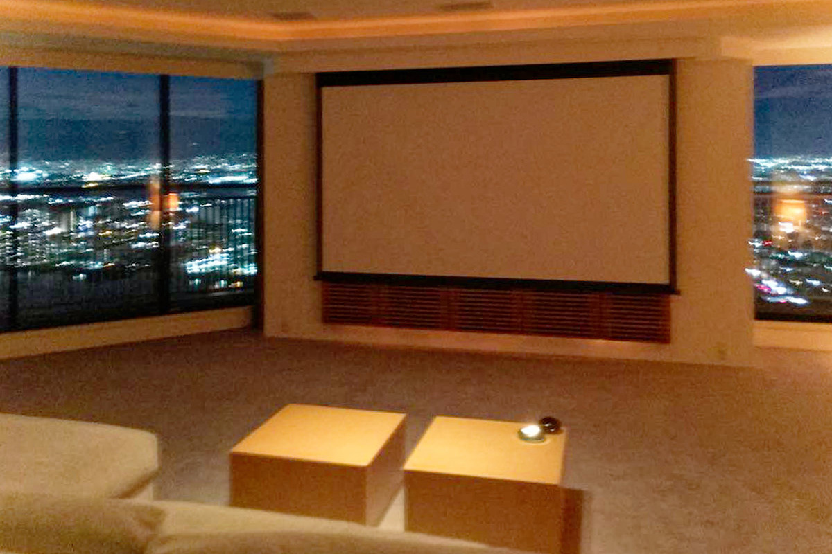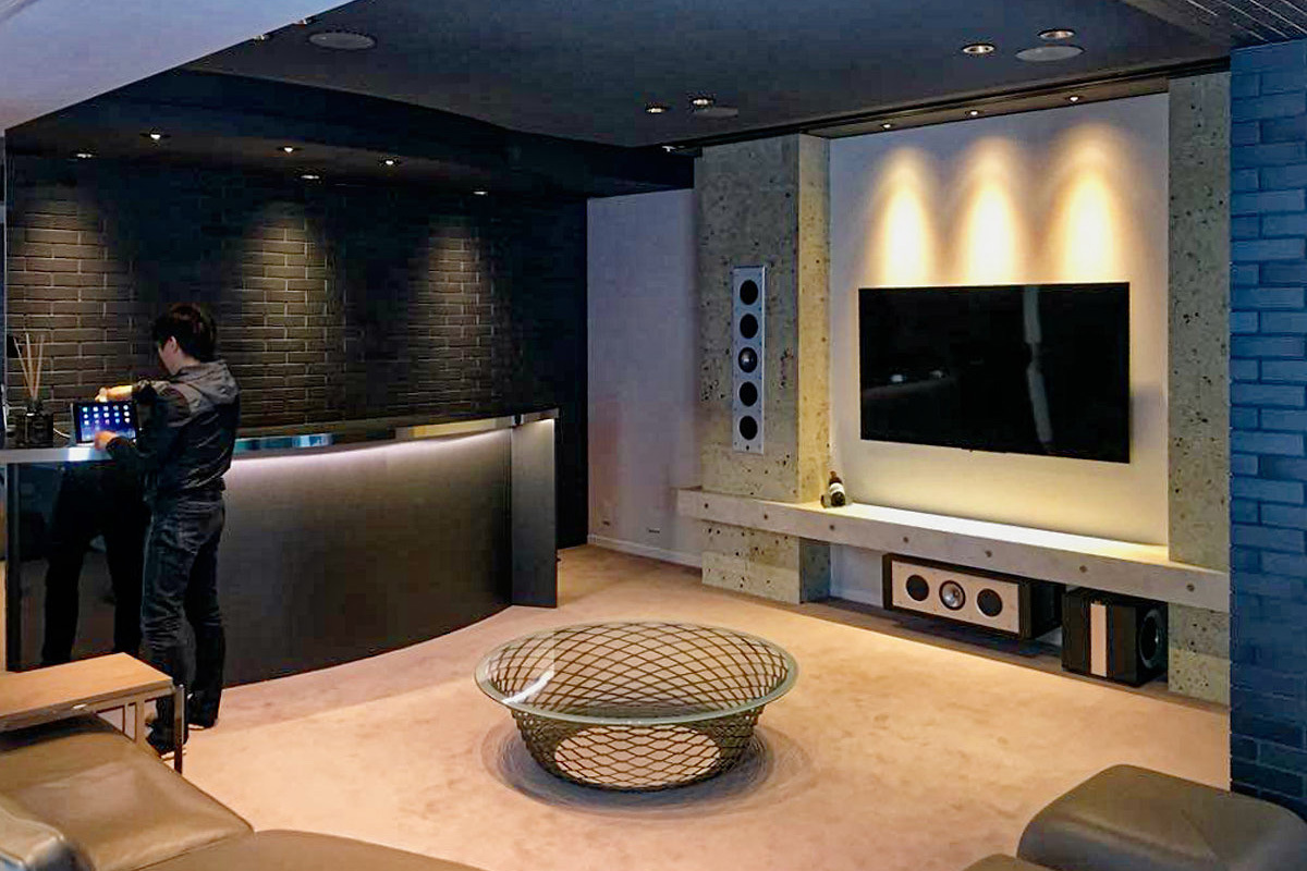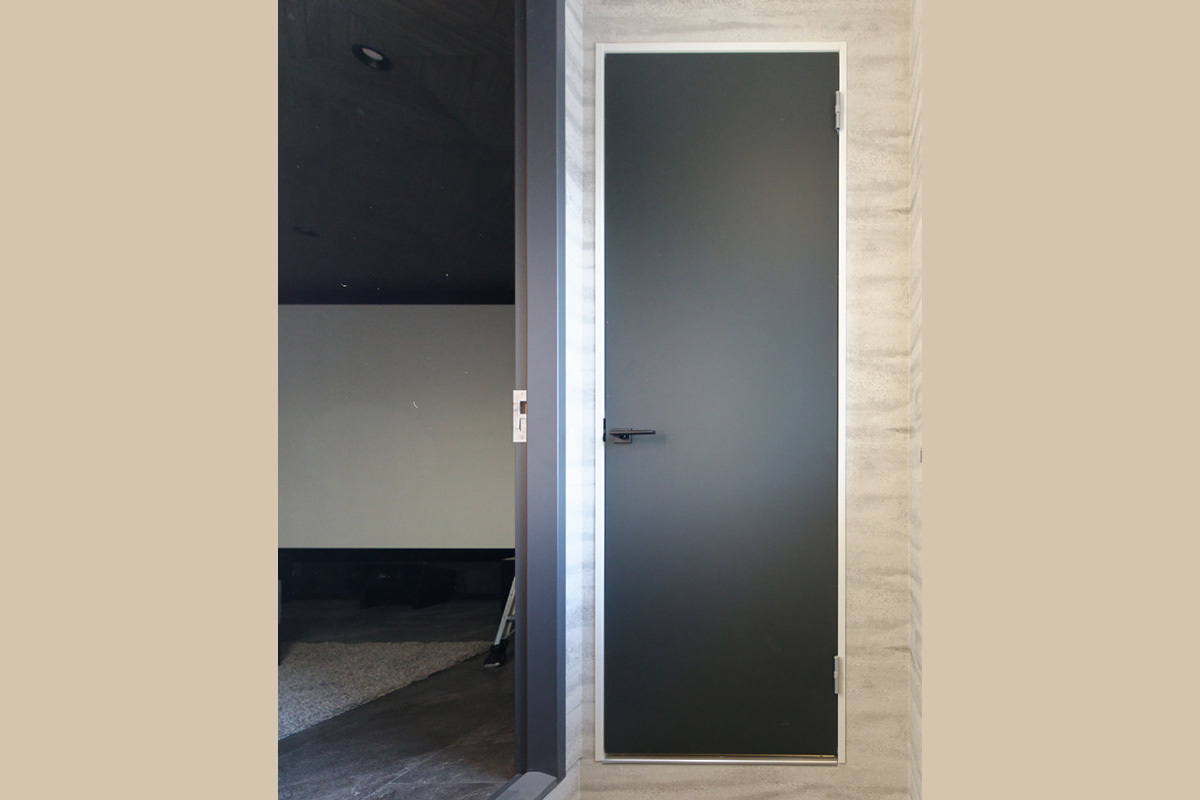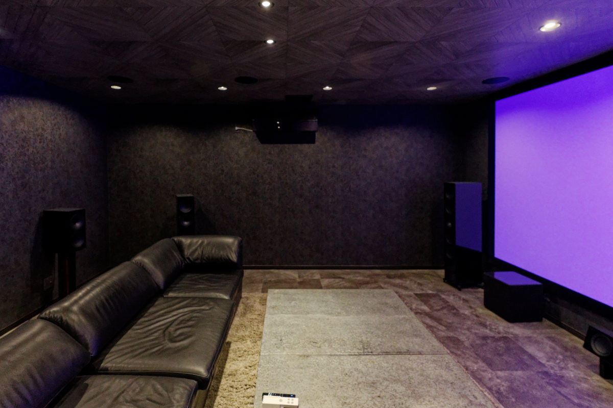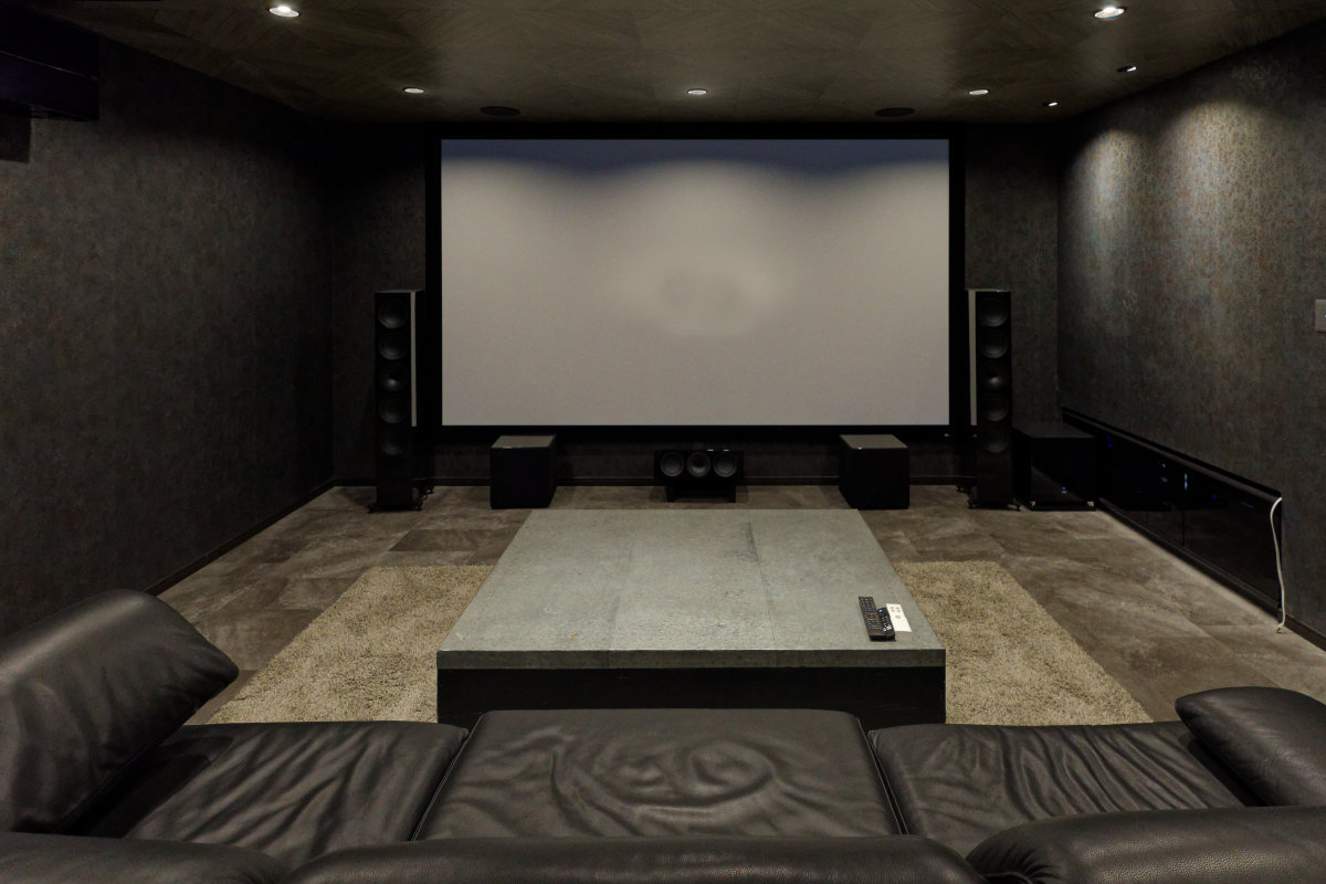 そういった目的の部屋なので、リビングシアターをイメージしながらも、お客さんが映像や音のクオリティを確認しやすいように設計。内装は少し彩色感がありながらも全体としてはシックなグレイッシュ仕上げとなっている。