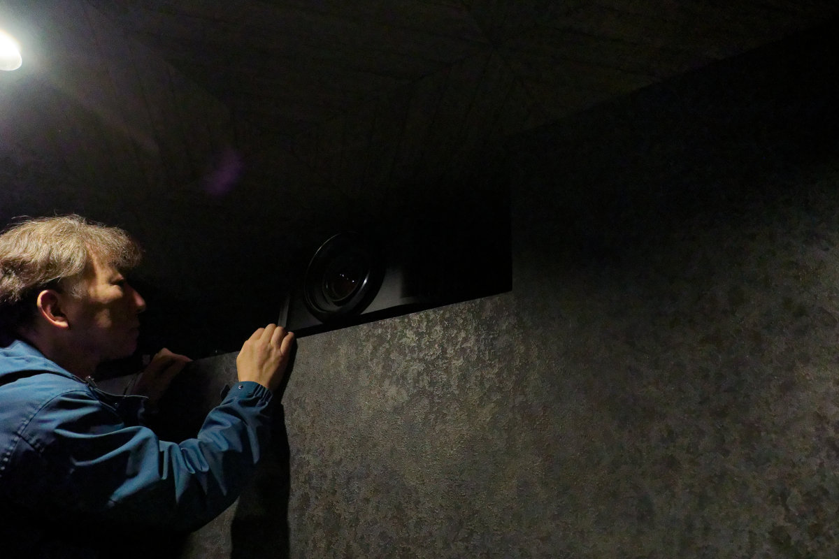 AV Kansai京都店には、オーディオ試聴室のほかに約20畳のシアタールームも完備。3階にひっそりと存在する完全予約制のショールームで、ホームシアターを導入されることがほぼ決まっているお客さんを個別に招き、機材選定のための比較視聴など最終的なプランニングを詰めるために設置されている。