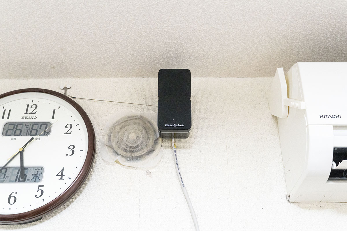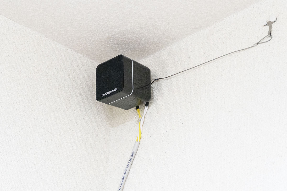 ハイトはCAMBRIDGE AUDIOの“MINXシリーズ”。音の高低差を出すため、可能な範囲で高い位置に壁掛け設置している。本シリーズはECLIPSEシリーズと設置性や指向性、高域に対する周波数特性に優れる点がイクリプススピーカーと相性が良いと感じたため採用した。取り付けは石膏ボード用のフックや落下防止ワイヤーを使うことで賃貸でも安心して使える。