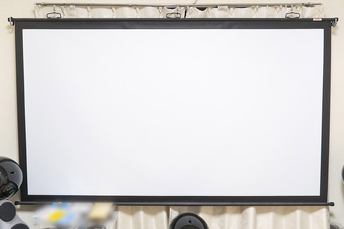 スクリーンはキクチ化学の「WAV-90HDC」。サイズは90インチで掛け軸タイプながらも上位クラスと同じホワイトマットアドバンスの生地が使われて投影された絵の繊細感も素晴らしく採用した。スクリーンはカーテンレールにS字フックを取り付けている。