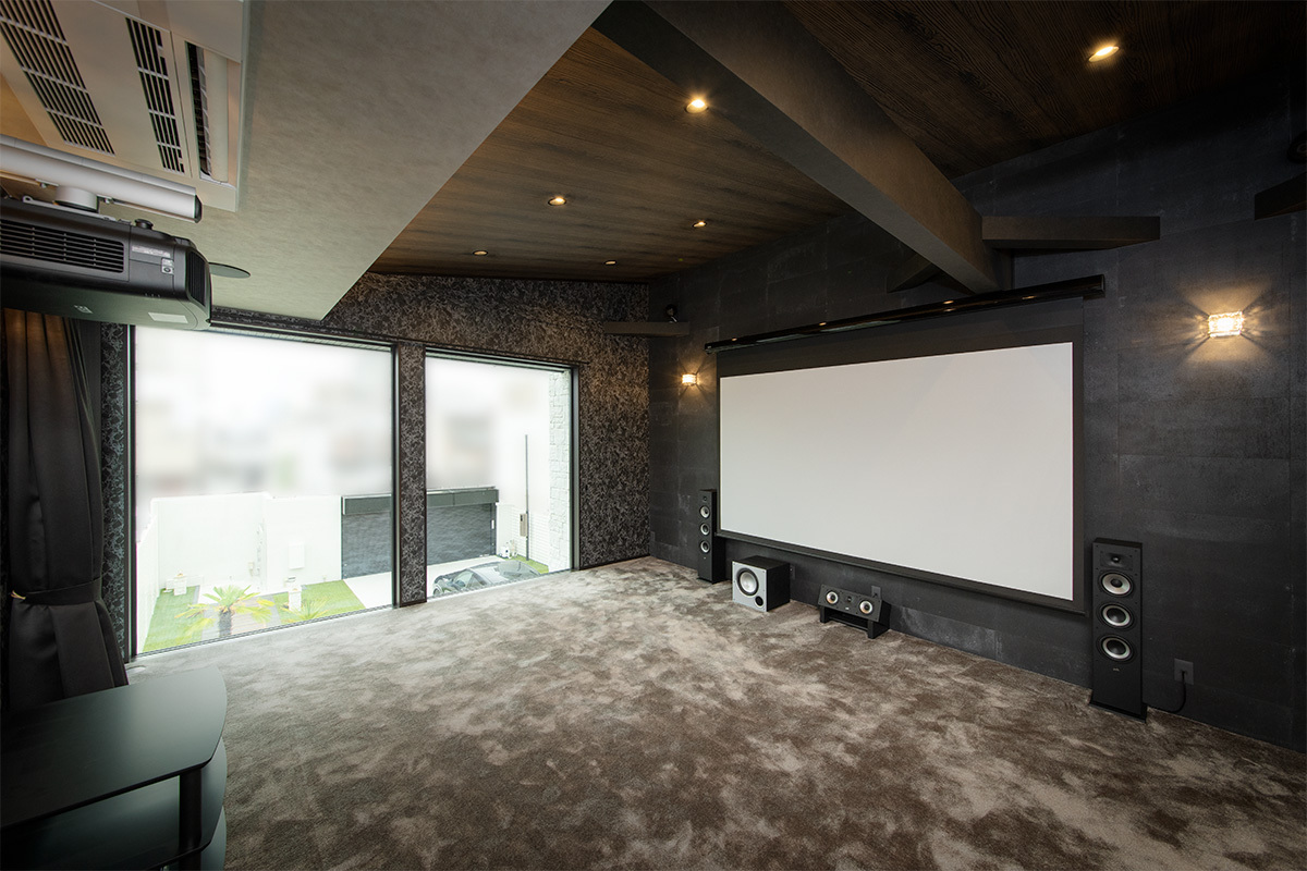 帰りたくなる家よりも、また訪ねたくなる家を目指して新築計画をスタートしたというオーナー。そのコンセプトどおり、T邸は門をくぐった瞬間からまるで南国リゾートに足を踏み入れたかのよう。外構までこだわってしつらえた贅沢な邸宅の2階に、一転ダークトーンでまとめられ、落ち着いた大人の雰囲気を醸すシアタールームが存在する。