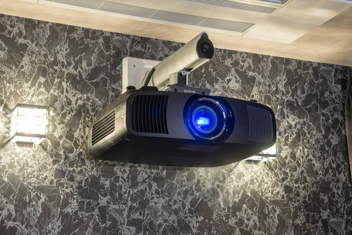 まず、プロジェクターにはTさんがお好きだというアクション洋画も、明るく色鮮やかな画質で楽しめるエプソンの4K/HDR対応モデル「EH-LS12000」を採用。空調の位置との兼ね合いで、壁に梁を取り付けて壁掛け設置としている。