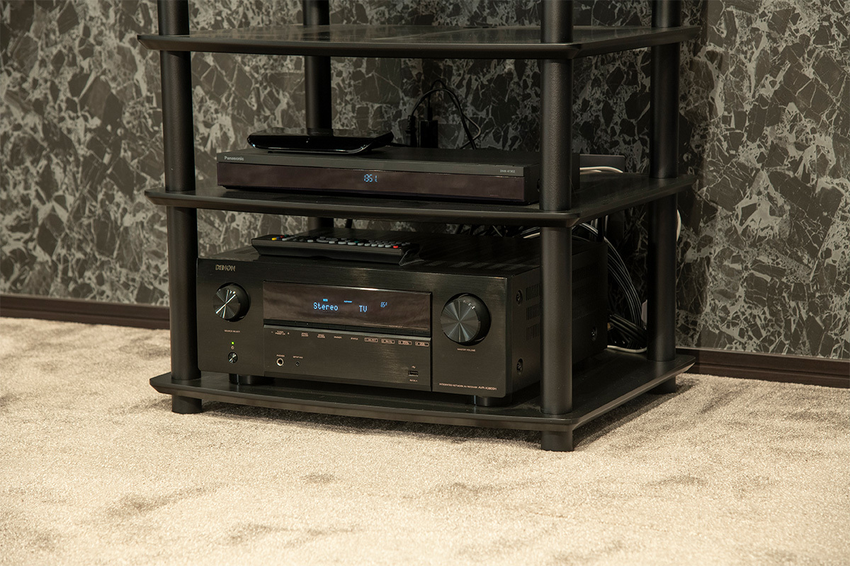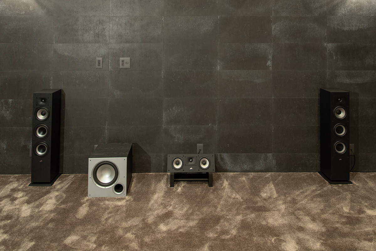 フロントおよびセンタースピーカーはPolk Audio “MONITOR XTシリーズ” で揃えて音色の統一を図ったほか、いずれのスピーカーも部屋の美観にマッチするブラックカラーをチョイス。
