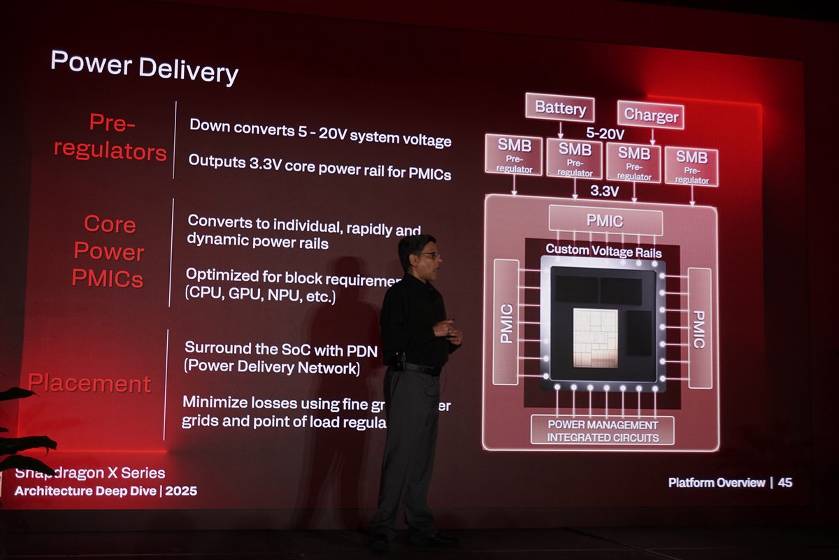 アーキテクチャの観点からはやや込み入った話になるため、アガシュ氏の説明を概略化すると、X2 EliteのSoCには2段階で電力をきれいに整えたうえで、必要な箇所にだけ必要なぶんの電力を迅速に送り出す配電システムがあるという。