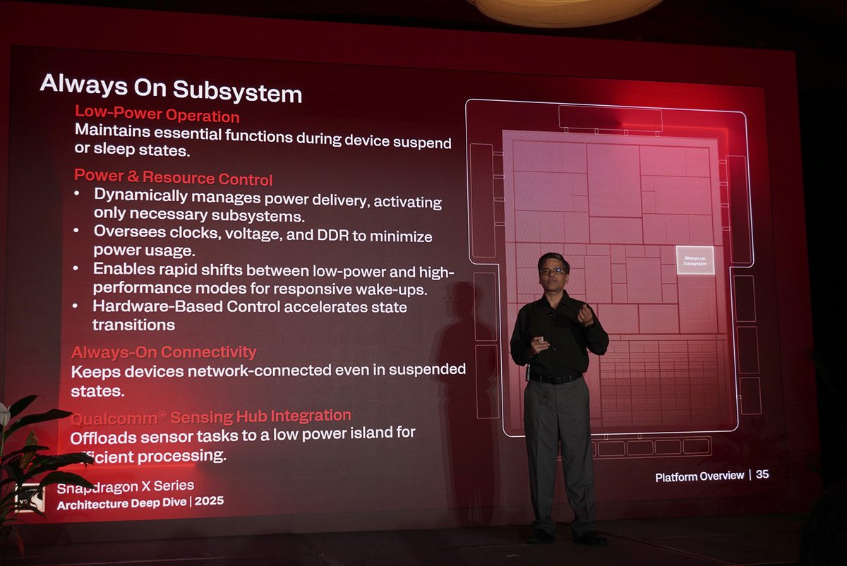 ひとつはSnapdragon X2 EliteのSoCに統合された「Always On Subsystem」だ。デバイスのCPUやDRAMがスリープ状態・スタンバイ状態にあっても常時稼働する省電力領域が設けられている。