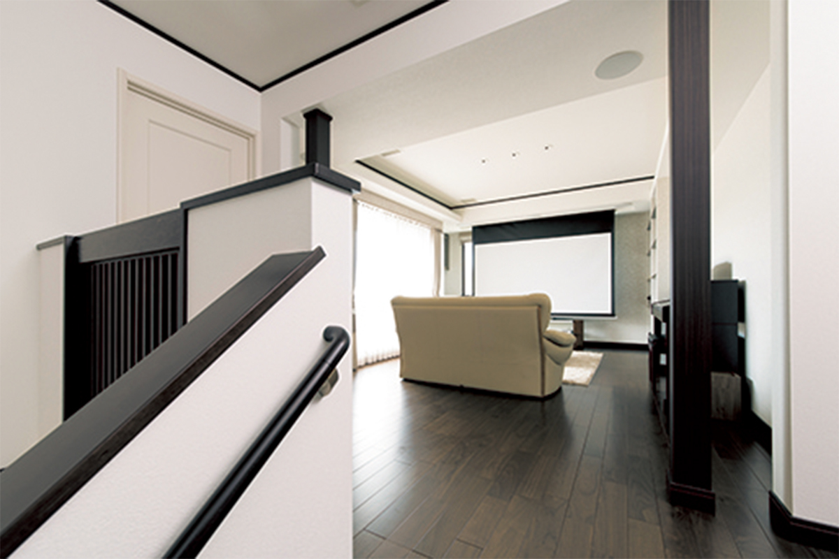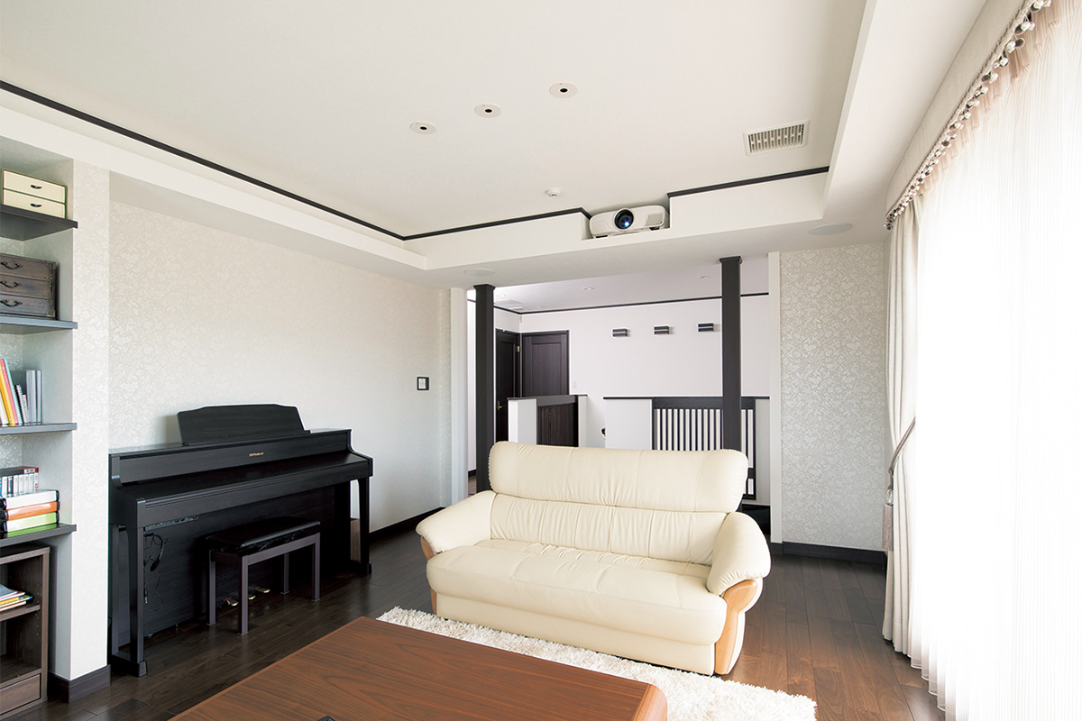 「1階のリビングは客間に近いイメージで、家族がくつろぐための空間は別に用意したかったのです」とご主人。そして、心を解放する癒しを与えてくれるのがホームシアターだったのだ。