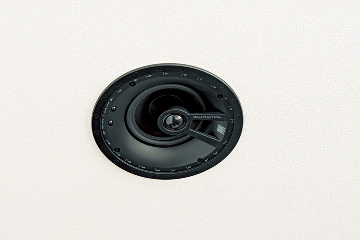 スピーカーはデンマークのスピーカーブランドであるDALI「PHANTOM E-50」を折り上げ天井の造作を活用して、5ch分すべて埋め込んだ。これは松尾氏がサウンドと価格のバランスを考慮してチョイスしたものだ。
