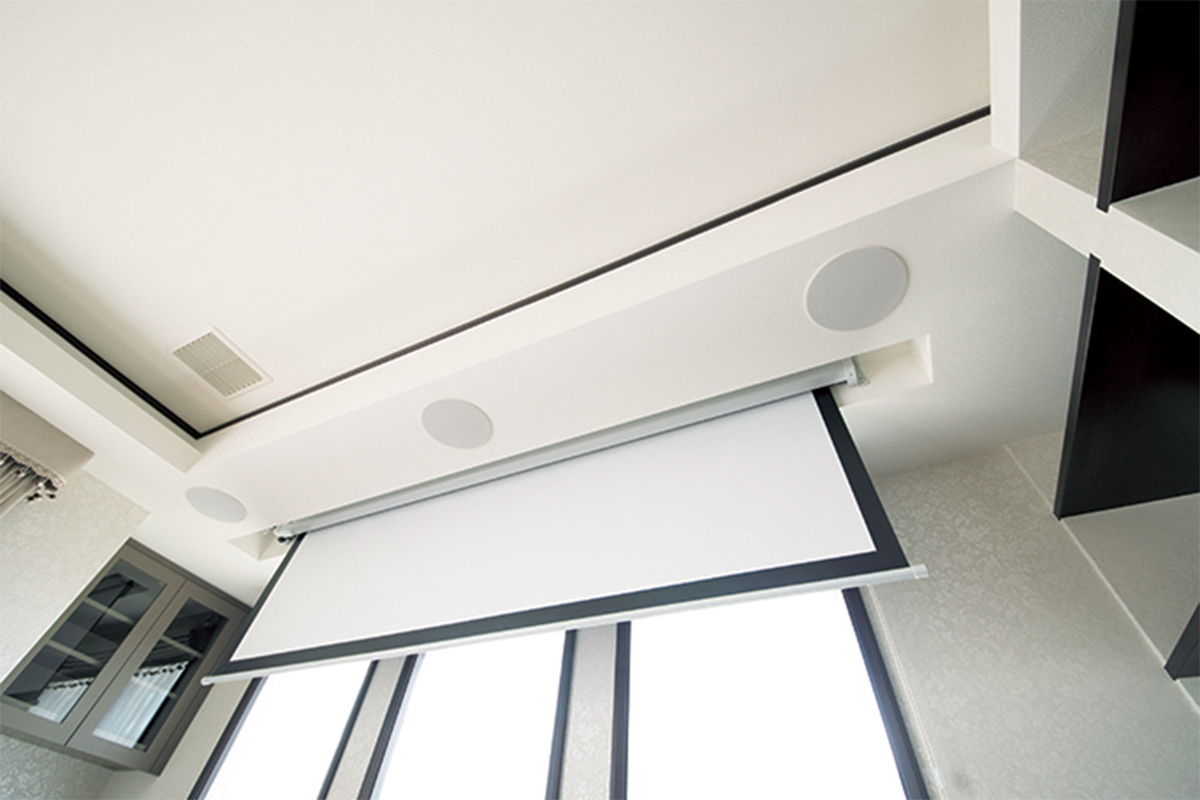 映像面は薄明かりが残る環境でもパワフルな映像を投写できるエプソンの4Kプロジェクター「EH-TW8300」。スクリーンは100型で、天井を掘り込んで設置。スクリーンを上げてしまうと、ホームシアターの存在がわからないほど、機器類が美しくインストールされている。