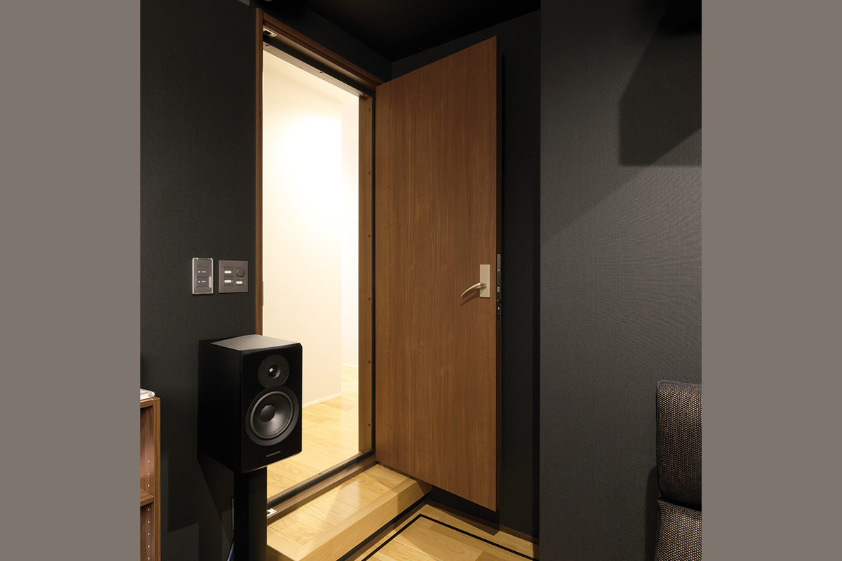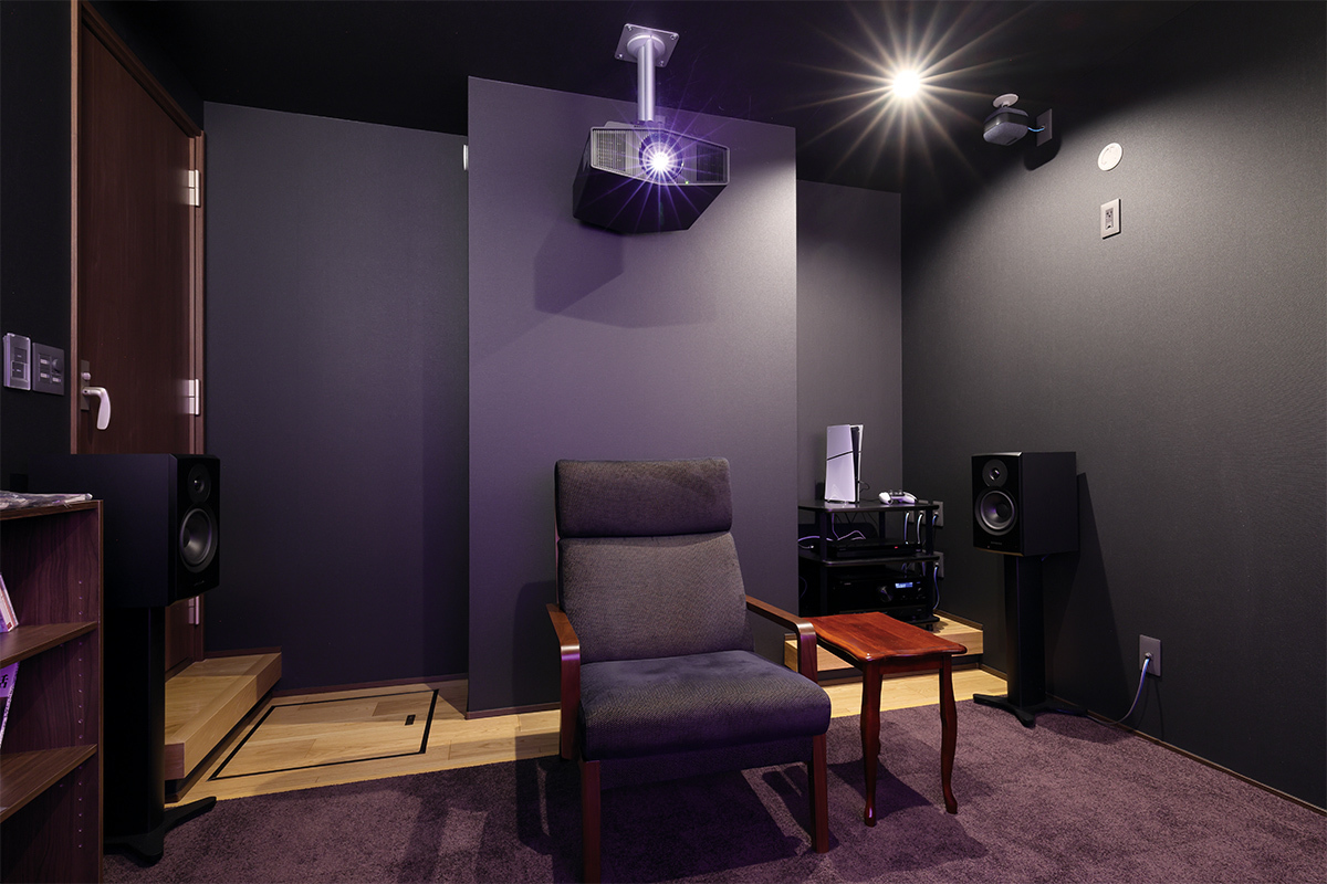 シアタールームはハウスメーカーの積水ハウスが手がけた防音仕様。壁と壁との間に十分な空気層を設けたほか、音や振動を伝える躯体との縁を切る設計にすることで、楽器演奏ができるほどの高い遮音性能を備えているという。