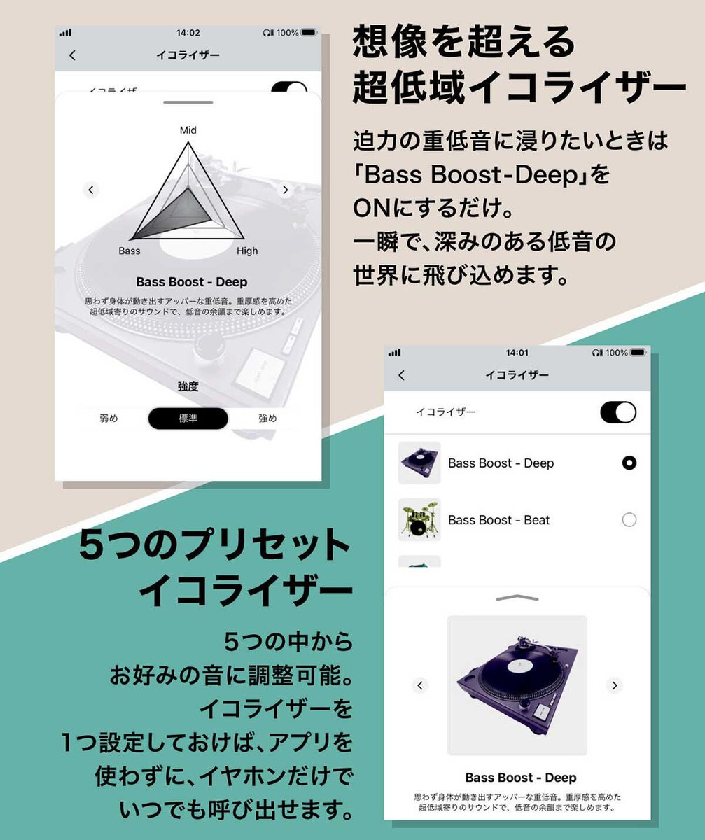 「ATH-CKS30TW+」は “刺激的な音体験” を提供するための、専用イコライザーの搭載がトピック。迫力ある重低音が楽しめる「Bass Boost - Deep」を筆頭に5種類のプリセットが搭載され、さらに専用アプリから強弱の調整もできる。自分のよく聴くジャンルに合わせて使いこなしてみるのも面白いだろう。