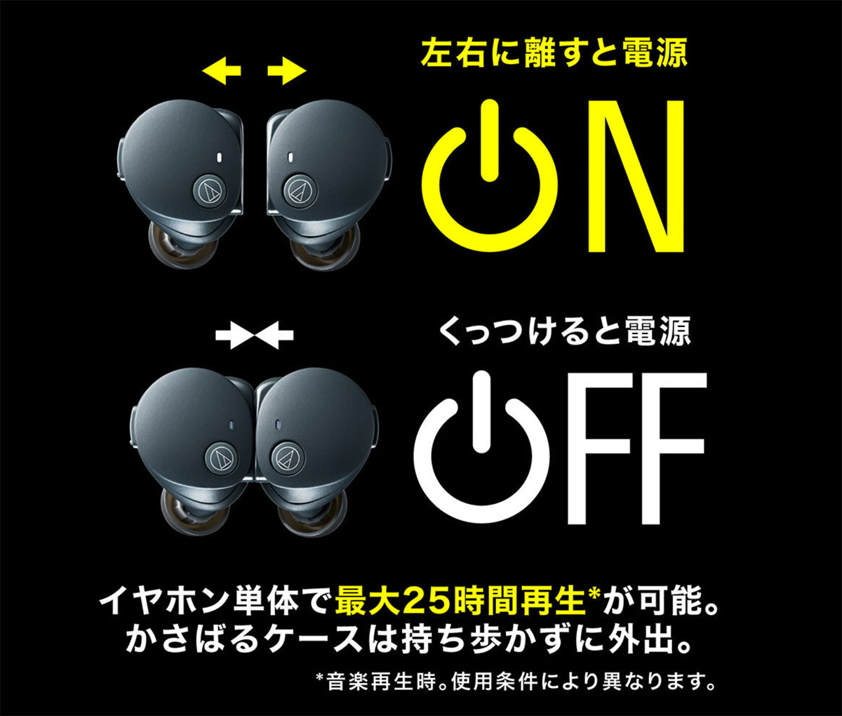 上位モデルの「ATH-CKS50TW2」は、オーディオテクニカ独自の「マグネティックスイッチTM(PAT.P)」を搭載する。イヤホンにマグネットが内蔵されており、左右のイヤホンを離すと電源が入り、くっつけると電源がオフになるもので、バッテリー切れの心配が減る安心の使い勝手を実現してくれる。イヤホン本体で最大約25時間(ノイズキャンセリグ/オフ)の再生ができるので、1日中外出する場合でも問題ない。