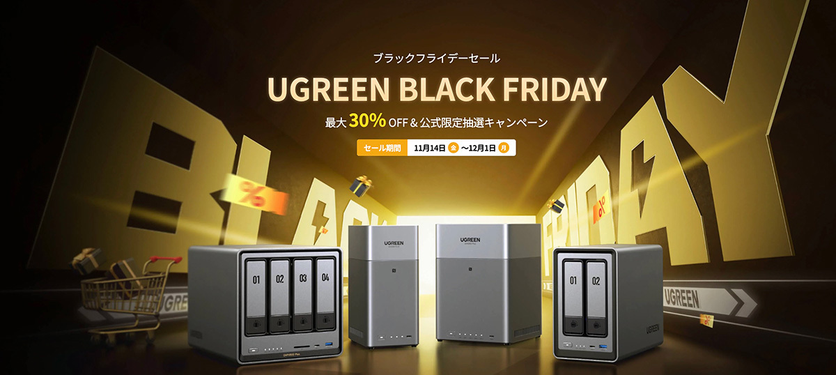 今回のブラックフライデーでは、UGREEN NASyncシリーズが過去最大規模のセール対象となる。最大30%オフ、さらに延長保証や送料無料特典も付帯予定だ。